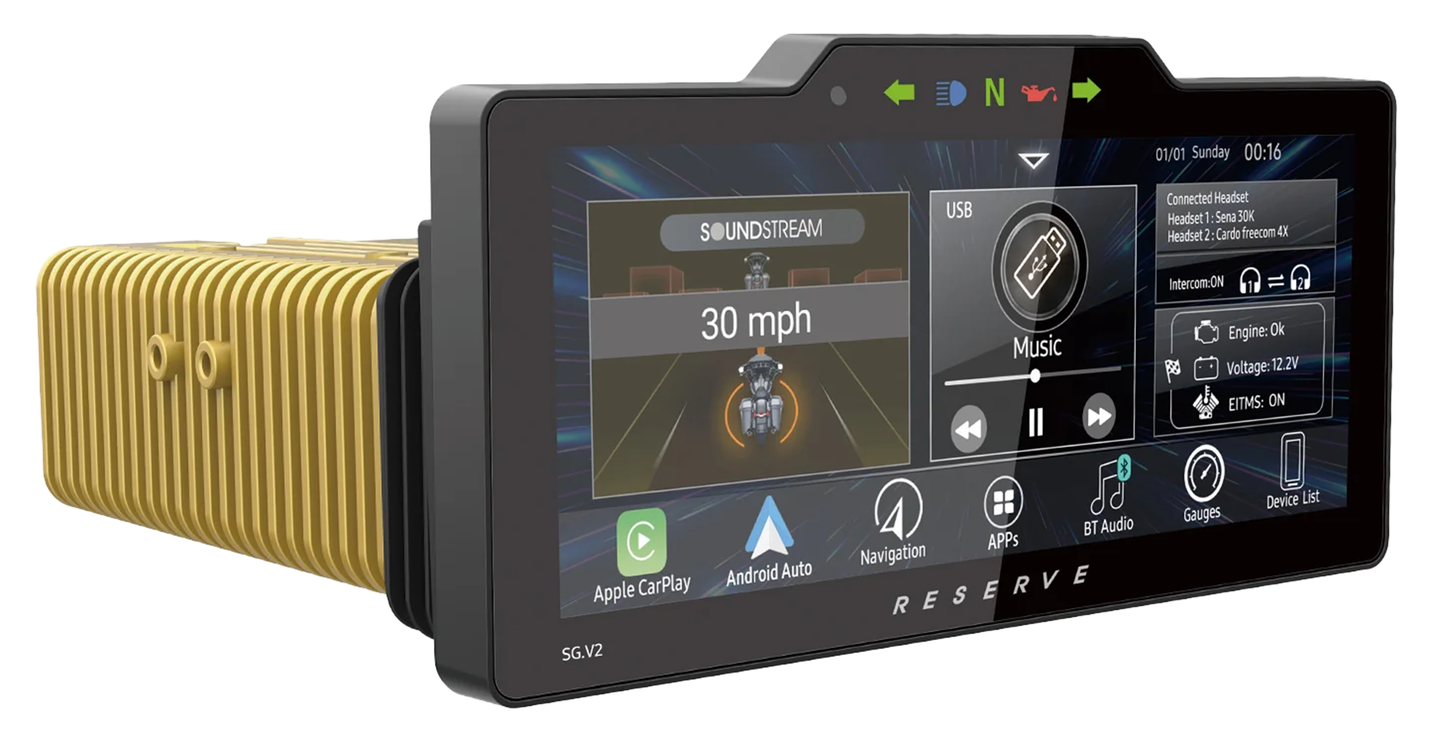 The Soundstream Reserve SG.V2 sets a new standard for audio and connectivity on 1998-2013 Batwing equipped touring models. Designed as a direct Plug-n-Play replacement, the SG.V2 installs seamlessly into the factory fairing with no brackets, trim rings, or antenna adapters required. Enjoy full smartphone integration without the hassle of cables with wireless CarPlay/AndroidAuto compatibility. Access maps, music, calls, and messages on the 8.3″ widescreen display or through voice assistants like Siri and Google Assistant, all designed to keep you connected while staying focused on the ride. Take your bike’s electronics to the next level with iDataLink Maestro compatibility. Display up to 10 digital gauges, choose from 20+ layouts, and receive real-time alerts for oil pressure, fuel level, engine temperature, and more. Riders can also customize their handlebar thumb controls for a personalized setup. Pair up to two headsets or earbuds for rider and passenger. Choose to hear GPS directions, music, or both, ensuring every ride is as clear and comfortable as it is connected. Bring the group together with Rally Mode, Soundstream’s exclusive music-sharing feature. Broadcast your playlist to an unlimited number of nearby Rally Mode-equipped riders and accessories, keeping everyone in sync on the road. The 8.3″ high-definition LCD with a 1000NIT backlight delivers crisp visuals in any lighting condition. Its widescreen format and capacitive touchscreen make navigation and media control effortless, even under direct sunlight. Equipped with a 200W 4-channel Class D amplifier (2ohm stable), the SG.V2 drives your system with strength and clarity right out of the box. Perfect for riders who want premium sound without relying solely on external amps. Fine-tune your system with a 15-band digital equalizer offering both preset and custom settings. Separate high-pass crossovers for front and rear channels, plus a dedicated subwoofer output with low-pass and subsonic filtering, ensure precision sound shaping. Ready for bigger builds, the SG.V2 includes 5-volt RCA outputs for front, rear, and subwoofer amplifiers. This clean, strong signal is ideal for powering aftermarket audio upgrades while maintaining maximum sound quality.