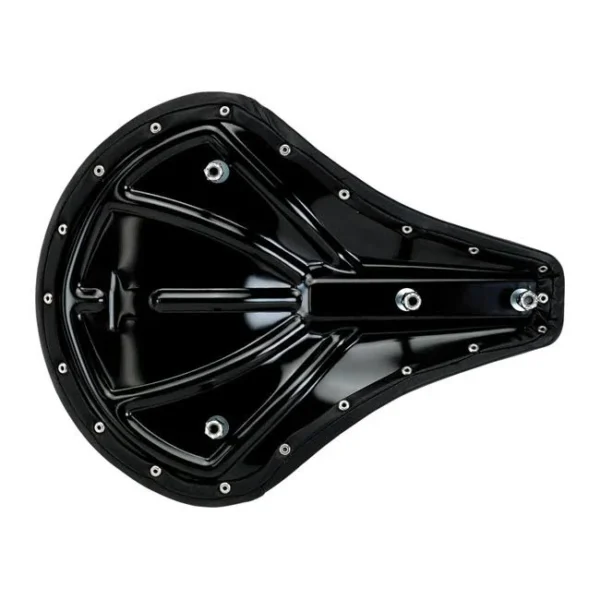 - Heavy-gauge stamped steel pan with gently sloping rear kick for added support