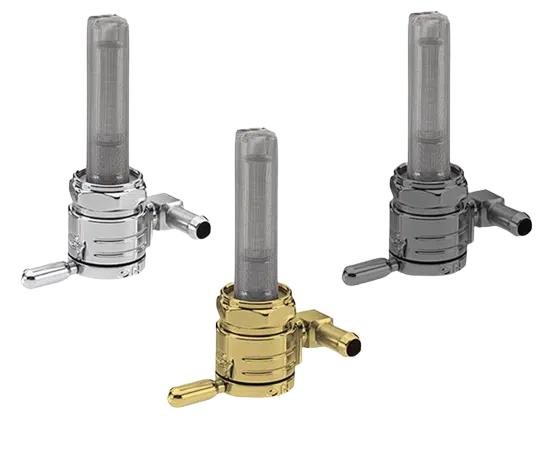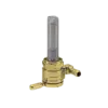 Backward outlet. Constructed from 360 brass with stainless steel ball bearings to eliminate rough, sticky or even frozen valve action. Between on, reserve and off. A special, easy to feel, detent will keep the fuel selector from accidental shifting from motor vibrations. Large 180 degree between on and reserve position for safety. O-ring seating will secure the fuel valve from leaking. Flow rate approx. 112 oz (3175 gram) per minute. Comes with a 5/16″ fuel hose connection.