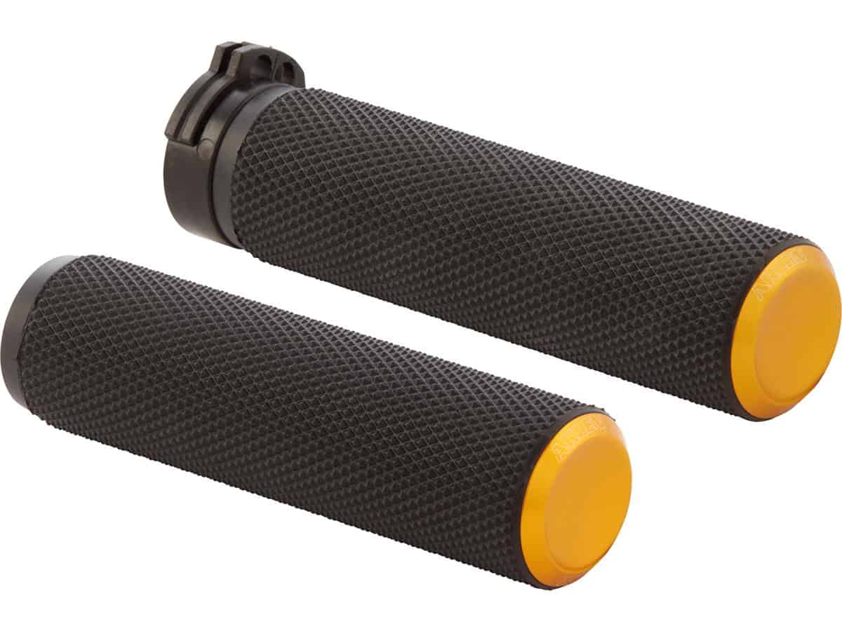 Arlen Ness, Knurled Fusion Grips Black Rubber, Gold Endcap 1″ Throttle Cables, Knurled Fusion Grips Black Rubber, Gold Endcap 1″ Throttle Cables