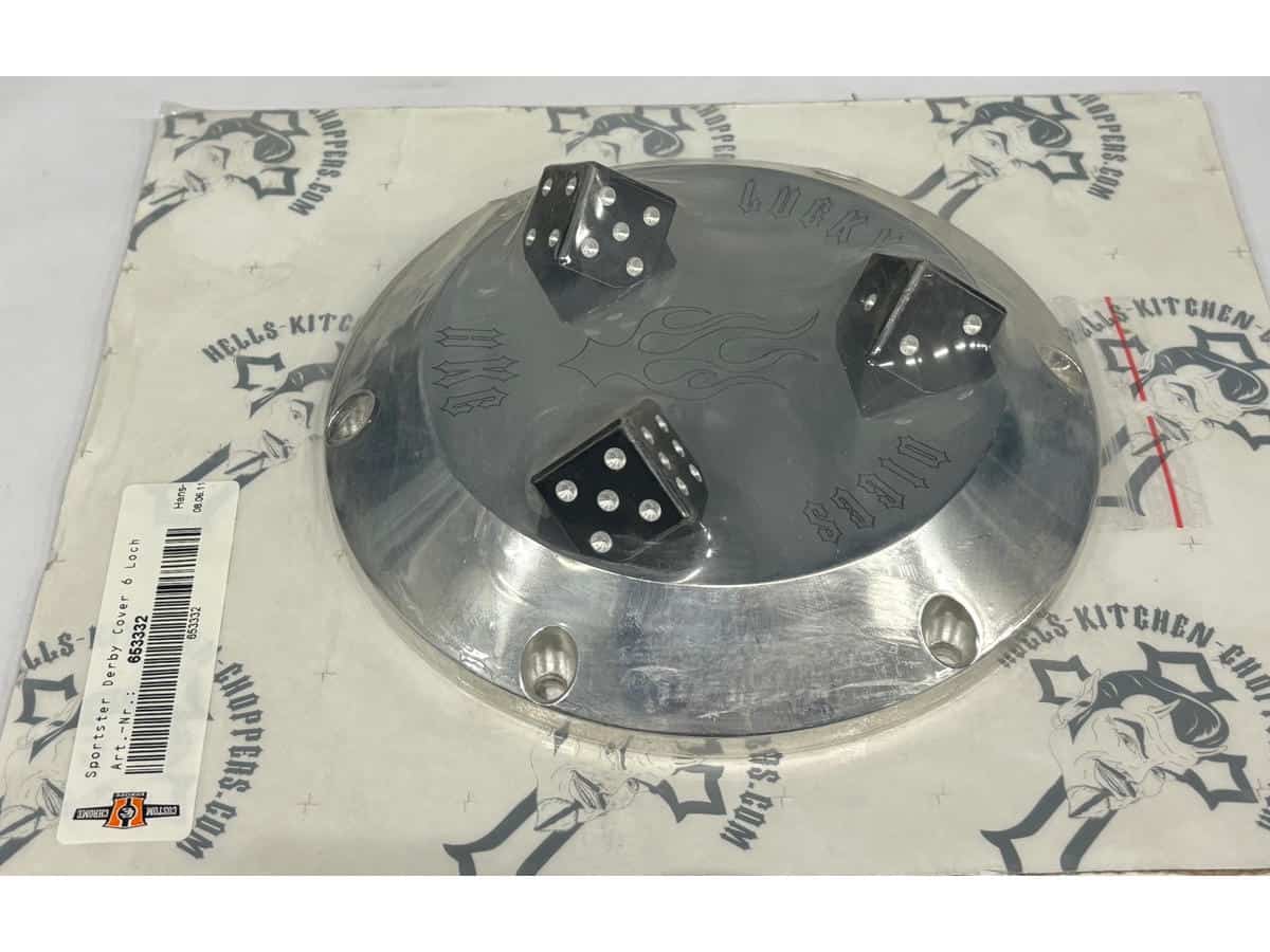 Hells Kitchen Choppers, Dice Derby Cover 6-hole Aluminium Polished, Dice Derby Cover 6-hole Aluminium Polished
