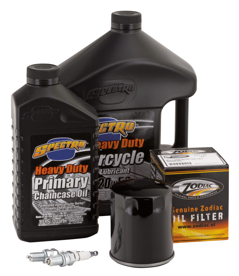Easy does it! Just one part number to get everything you need for an engine oil change, a complete oil change or an oil change complete with a spark plugs change. We have selected for you the right type of Spectro oils, volumes, right oil filter in black or chrome and put these together in one box. We also have kits that include the correct spark plugs. And for the most demanding riders with a 2006 or later 6-speed transmission we have Platinum Plus kits available that include Spectro’s special formulated noise-killing Platinum Gear oil. All kits are available with your choice of chrome plated oil filter or black painted oil filter.