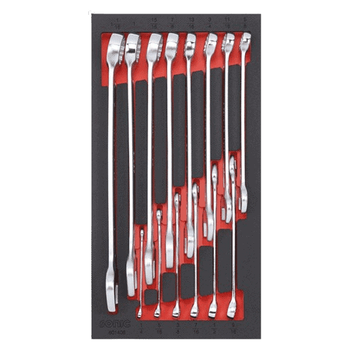14-piece Open end / box end combination wrench set. – In 190mm x 370mm x 74mm high high foam inlay, 1/3 SFS – 1/3 SFS. Foam inlay fits all 26″ tool trolleys. Kit includes: – 14x open/box end wrenches: 1/4″ to 5/8″