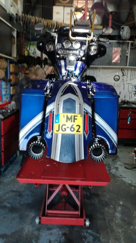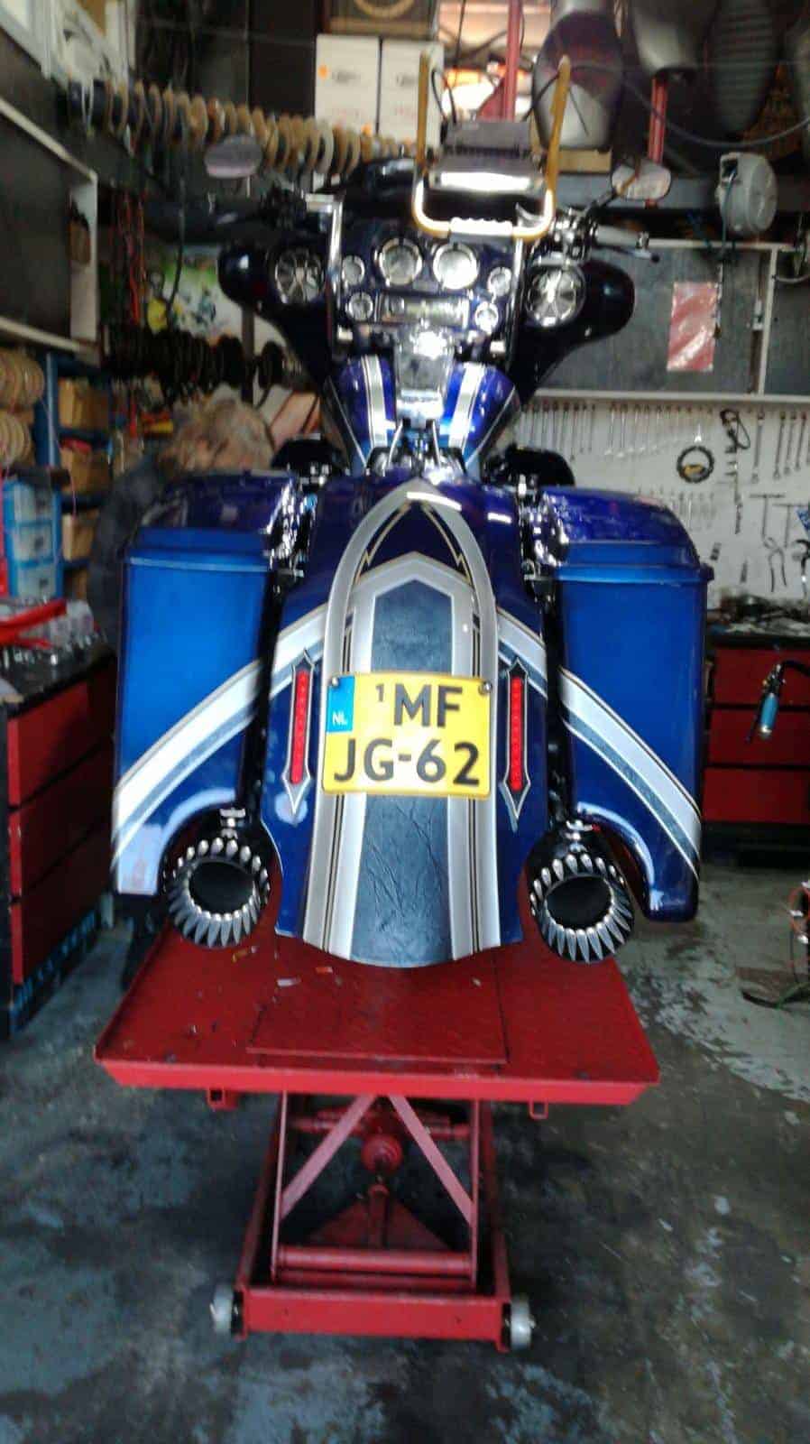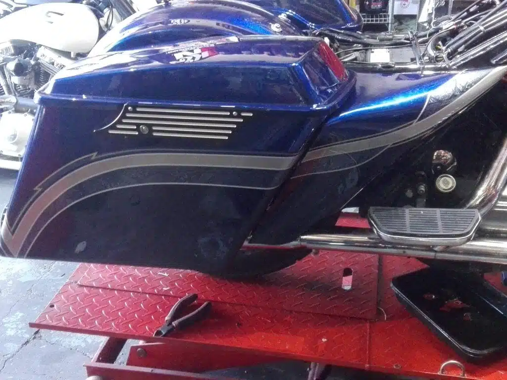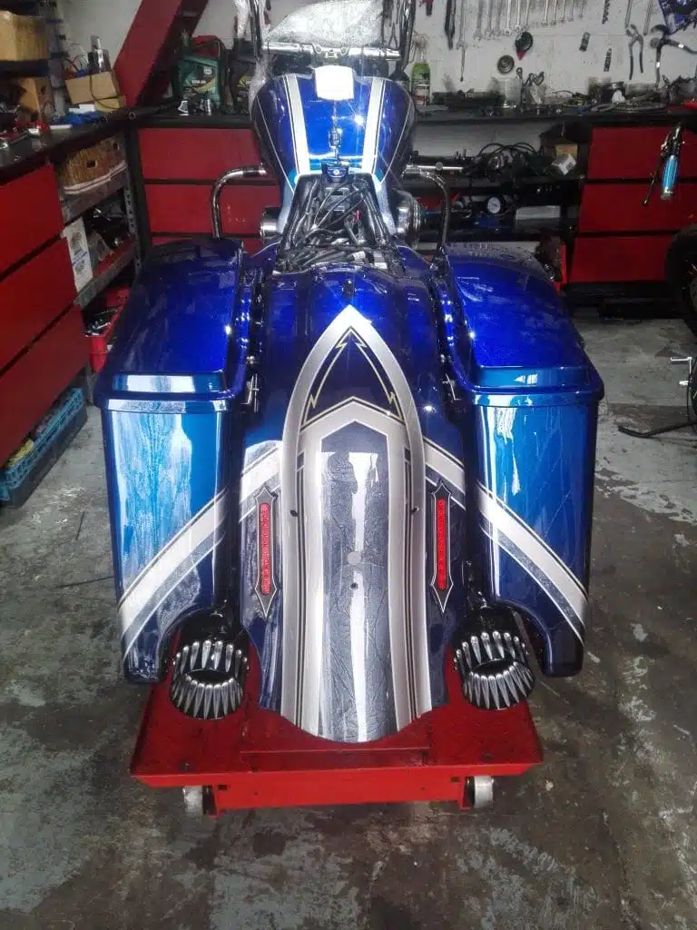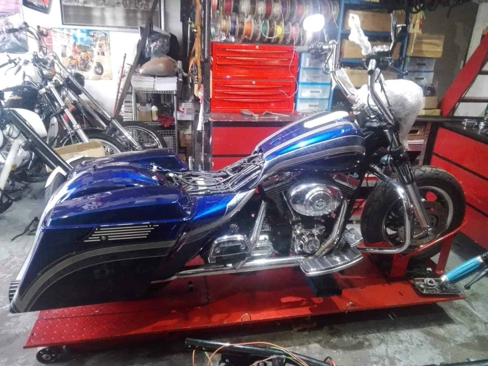 Alex’s Touring customized and repainted to a eye catching bagger