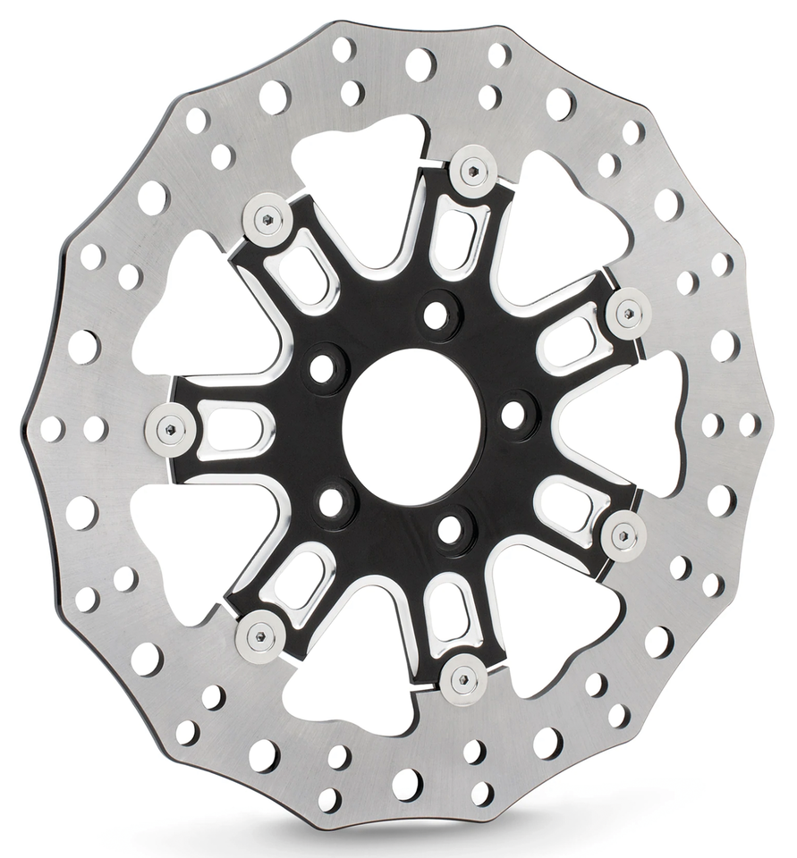 High performance floating brake rotors designed to enhance braking performance and style of factory or aftermarket wheels. Heavy Duty 420 Stainless Steel construction, drilled for optimum performance and heat dispersion and made for the weight of V-Twin & Touring motorcycles. All discs are sold each. We strongly recommend to install new brake discs with new brake pads. Unidirectional discs can be fitted left or right.