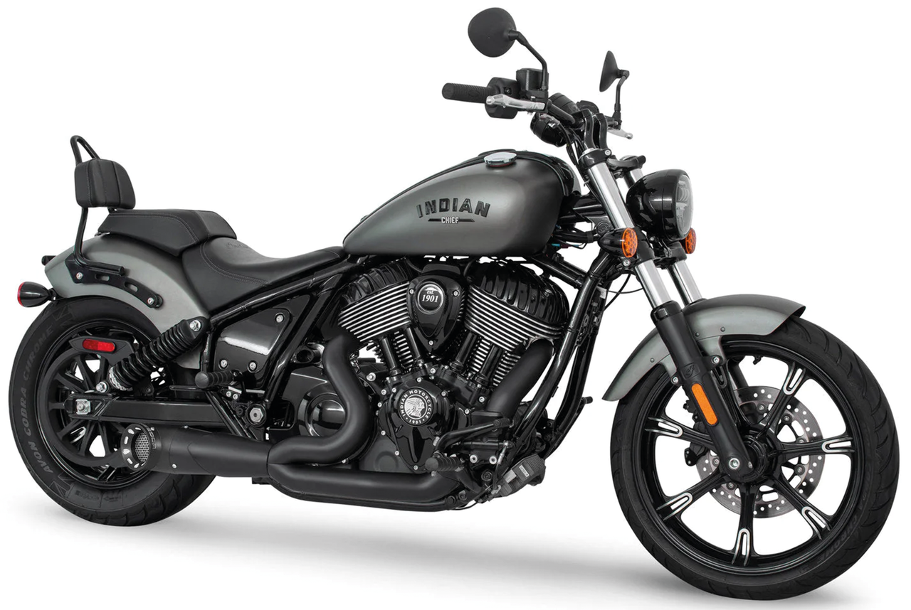 Fits 2022 to present Indian Chief Bobber, Chief Classic, Chief Dark Horse, Chief Standard, Chief Vintage & Super Chief, Black Turn-Out 2-into-1 with sculpted black Straight Cut end cap, 2-1 TRN-OUT BK W/ CNTR BK STRGHT CHIEF22, Freedom Performance Exhaust