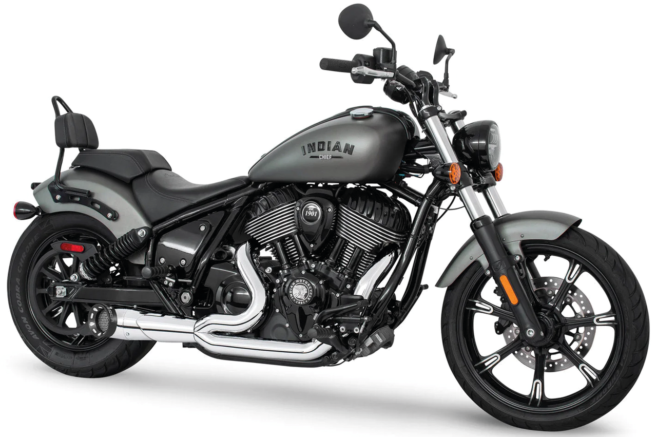 Fits 2022 to present Indian Chief Bobber, Chief Classic, Chief Dark Horse, Chief Standard, Chief Vintage & Super Chief, Chrome Turn-Out 2-into-1 with plain black Straight Cut end cap