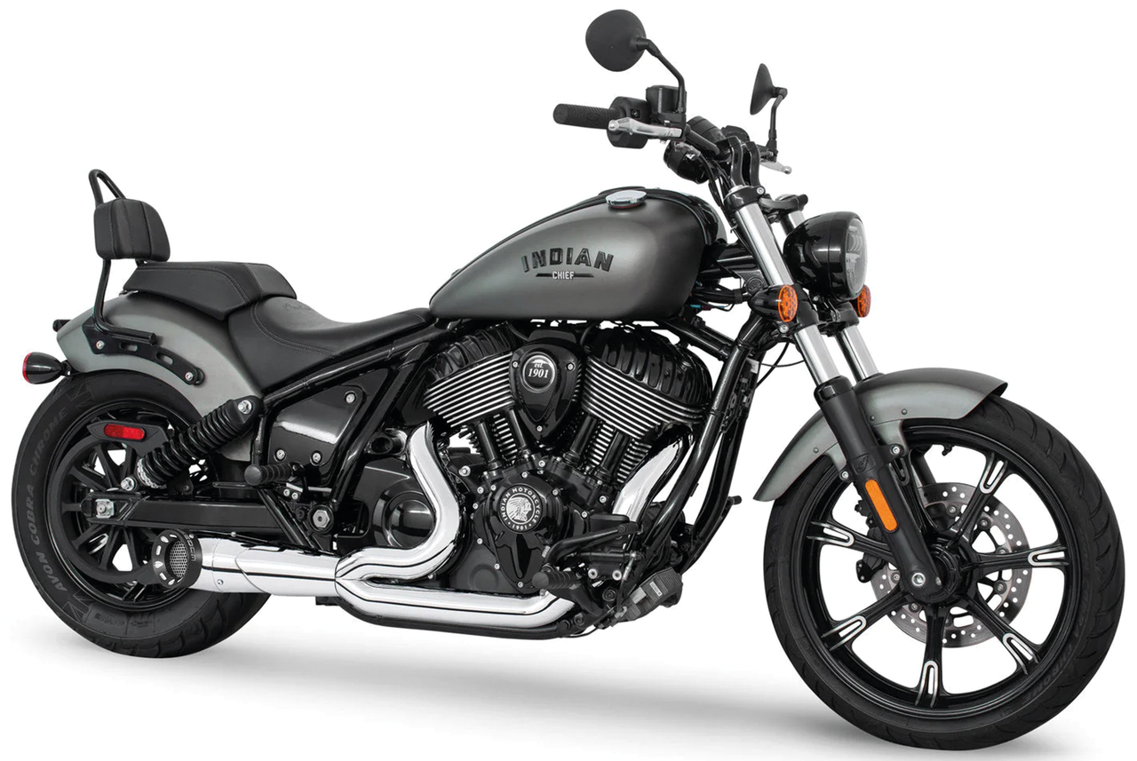 Fits 2022 to present Indian Chief Bobber, Chief Classic, Chief Dark Horse, Chief Standard, Chief Vintage & Super Chief, Chrome Turn-Out 2-into-1 with sculpted black Straight Cut end cap