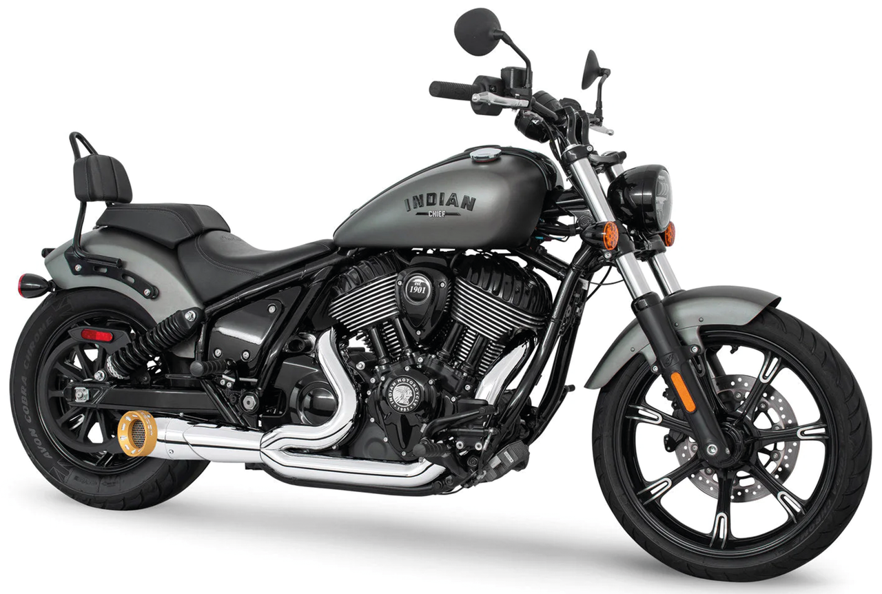 Fits 2022 to present Indian Chief Bobber, Chief Classic, Chief Dark Horse, Chief Standard, Chief Vintage & Super Chief, Chrome Turn-Out 2-into-1 with sculpted gold Straight Cut end cap