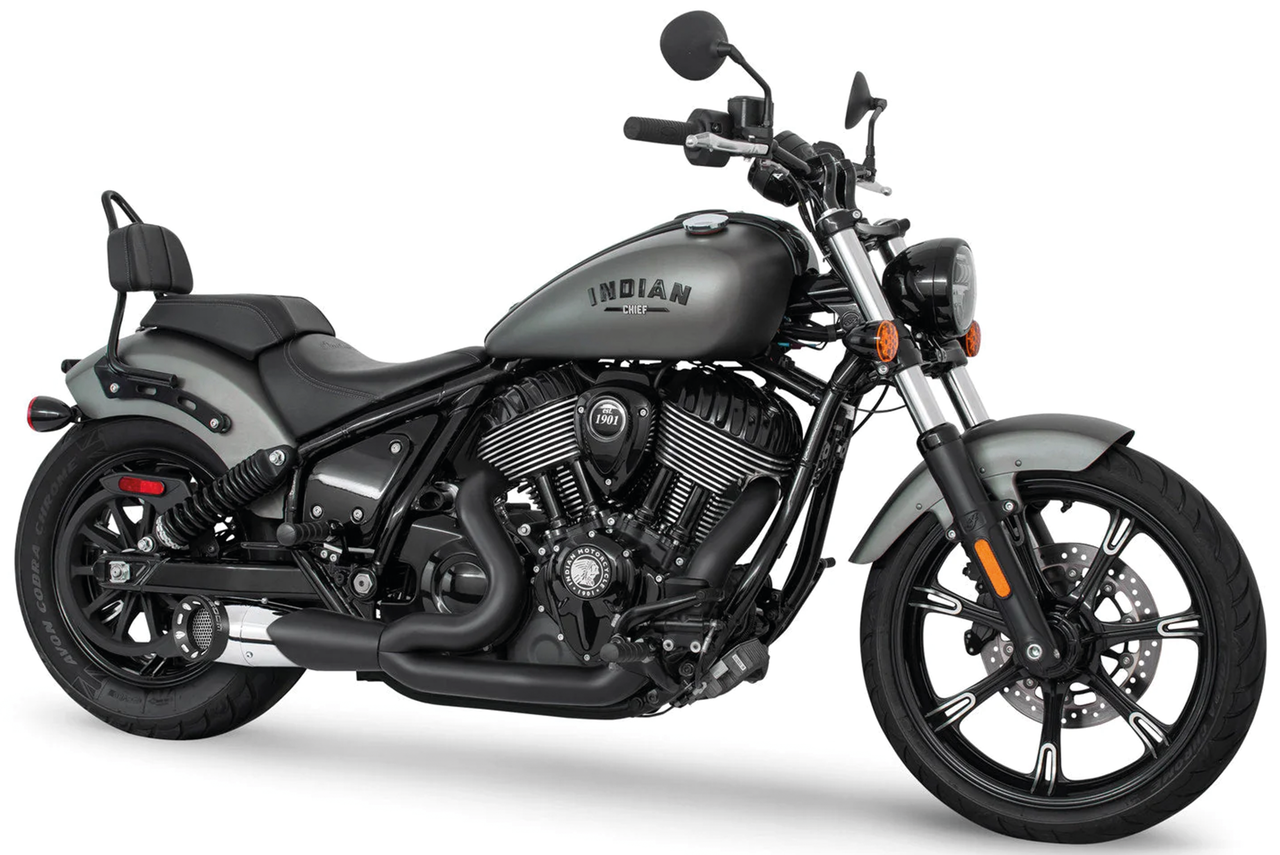 Fits 2022 to present Indian Chief Bobber, Chief Classic, Chief Dark Horse, Chief Standard, Chief Vintage & Super Chief, Chrome Turn-Out 2-into-1 with black muffler and chrome Straight Cut end cap