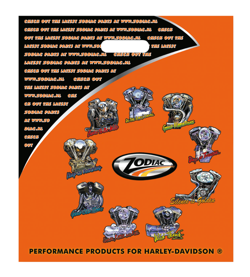 Made from fully recyclable Low Density Polyethylene these shopping bags are full color printed with the Zodiac logo surrounded by artist’s impressions from ten different Harley engines: Ironhead Sportster, Evolution Sportster, Flathead, Panhead, Knucklehead, early- and late Shovel, Evolution Big Twin, Twin Cam and Milwaukee Eight. These bags look so good, they will be a collector’s item soon. Bags are 16 1/8″ wide and 18 1/2″ high. Sold to dealers in packs of 25 pieces.