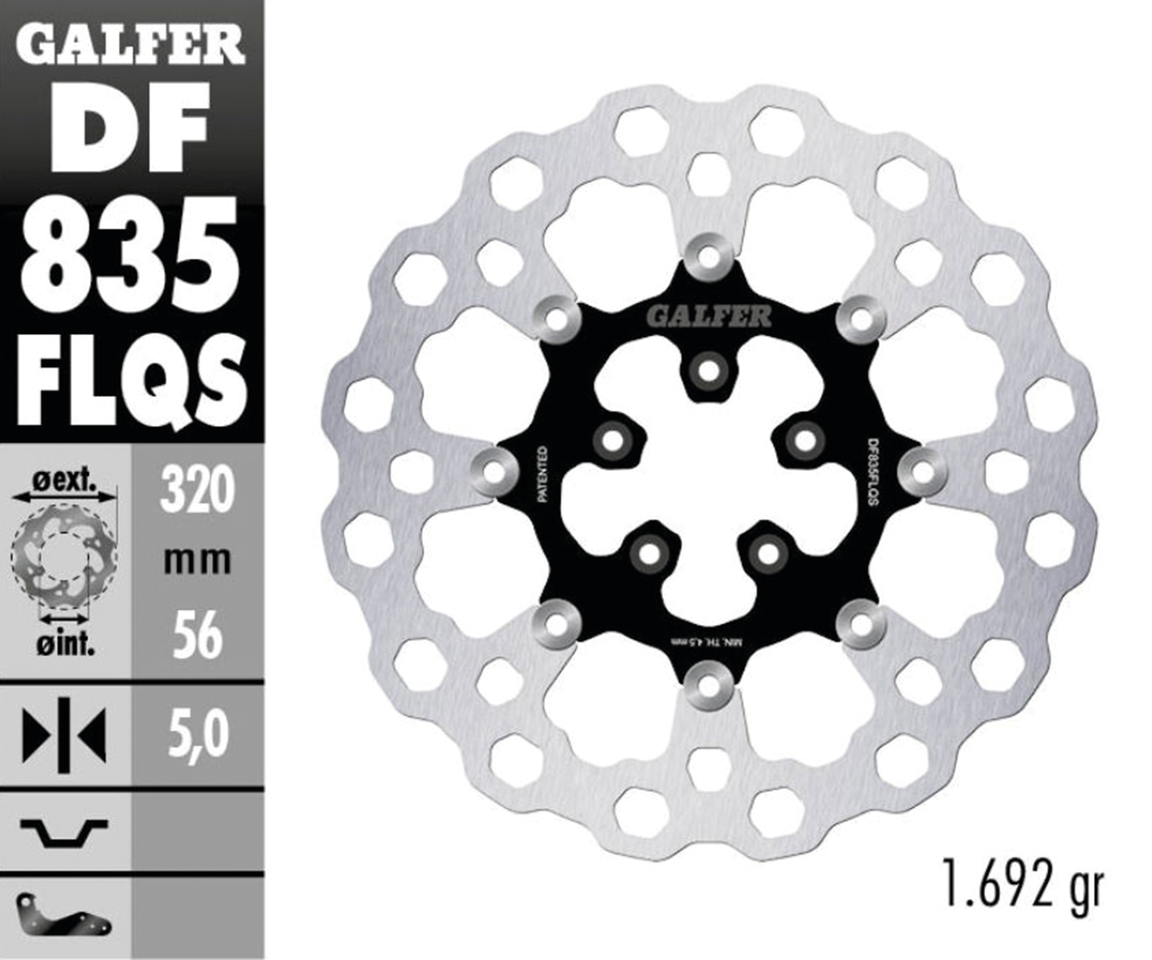5-Hole hub mounted discs, fits front on most 2000 to present modelsDisc has 2 7/32″ inner diameter drilled 5 x 5/16″ x 3 1/4″, Cubiq design oversized full floating disc, 12.6″ (320mm) outer diameter, Galfer DF835 Cubiq Floating 12.6″ Black, Galfer Performance Brakes