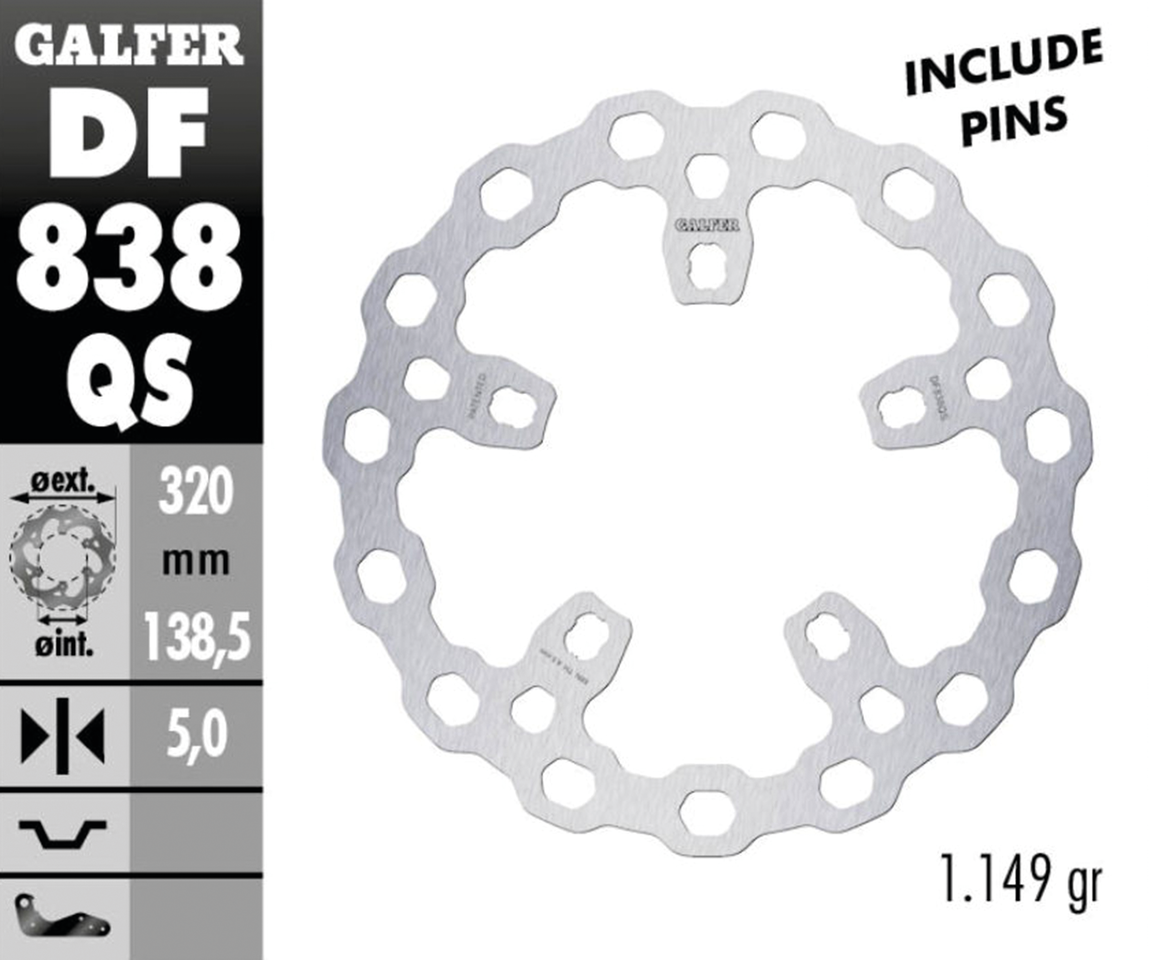 5-Hole spoke mounted discs, fits front on selected 2014 to present Touring with 49mm forks and originally supplied with 300mm discsDisc has a 138.5mm inner diameter and five special mounting holes, 170mm pitch, Cubiq design oversized full floating disc, 12.6″ (320mm) outer diameter, Galfer DF838 Cubiq Disc 12.6″, Galfer Performance Brakes