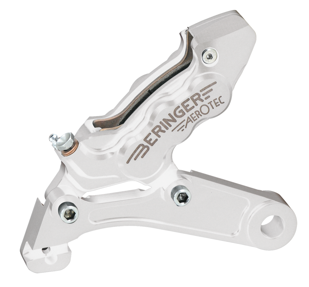 Beringer is manufacturing brake systems for more than 15 years and are appreciated by many factory and private racing teams for their exceptional reliability. The company achieved a decisive technological advantage because of their patented innovations. Beringer is also extensively engineering braking systems for any other motorcycle. Beringer brake systems are produced according to ISO 9001 and are approved. Their brake calipers are made out of aircraft quality aluminum, the same material as being used on wings of supersonic planes. This aluminum combines reduced weight and resistance to deformation, even at high temperatures. The pistons are made of stainless alloy. Stainless alloy only conducts one thirteenth of the heat conducted by aluminum, thus perfectly isolates the calipers from the heat generated by the brake pads. Furthermore, the stainless alloy pistons eliminate the possibility of corrosion. All calipers are CNC machined to meet the highest standards and guarantee optimized material thickness. Beringer calipers distinguish in incisive braking power with a very short response time. More aggressive and stronger braking is achieved at constant lever travel. With these calipers, only 16.5 bar pressure is needed to perform as good as 20 bar with other calipers to reach similar braking power. Calipers are available for front and rear in either 4-piston or 6-piston versions in polished, black anodized or chromed.