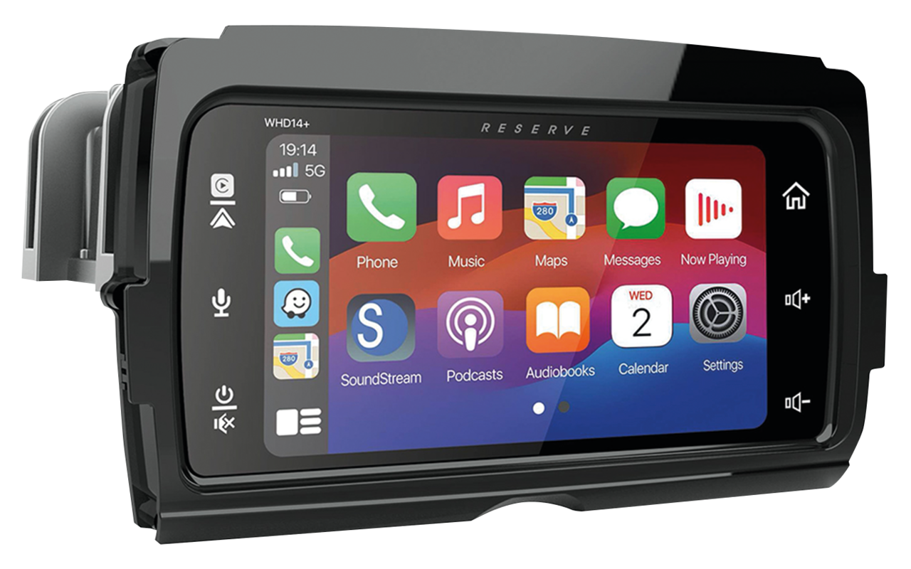 Plug-n-Play Soundstream Reserve Motorcycle Audio by Precision Power are upgrade head units for OEM Harley-Davidson radios. Apart from the regular AM/FM radio and Bluetooth connection for phone calls and music, these units allow you to do the things you want as you can do in your car using Apple CarPlay or Android Auto. By plugging in your phone using the USB outlet, for V-1 systems or wireless connecting for V-2 systems, you can get riding directions, send and receive messages and listen/browse music, all in a way that allows you to stay focused on the ride. You can even use Siri on your Apple phone or the Google Assistant on your Android phone to find fuel stops along your journey. You can see it all on your radio’s touchscreen display, helping you know more about what’s nearby. The apps themselves have been reimagined for easier viewing, so you can use them while your eyes and hands stay where they belong on the road. Head units feature 7″ (17.8cm) capacitive High-Definition touchscreen with customizable wallpaper/background .jpg & .jpeg via USB, USB Smartphone charging while connected (5V/1.5A), Low-Pressure IPx5 Rated Water Protection, built-in Equalizer, MP3/WMA/AAC/FLAC audio playback via USB (64GB Max), 50w per channel, 2 Ohm stable 4-channel amplifier, and 4V RCA Pre-outs, UV protection and conformal coated circuits. Units are bolt-in using the stock mounting hardware.