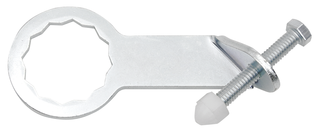 Axle locker tool acts as a third hand to help hold the left side welded axle nut. You will no longer need to find a helper to hold the nut or to reach around the tire to hold the nut yourself! The axle lock tool will hold the welded nut after setting the proper belt tension and limit movement to the low side of the adjuster cam, this will stop the belt from losing its adjustment during torquing. Simply place the tool over the welded nut on the left side with the neck portion of tool resting over the swing arm. Hand screw the adjusting screw to take up any slack. Then you are able to torque the axle nut from the right side knowing that the welded nut will not turn.