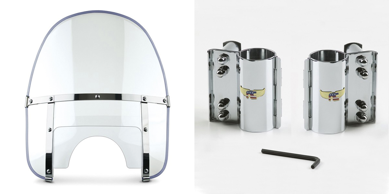 Fits 41mm front forks on 1993-2005 FXDWG, 1980-1985 FXWG, 1983 FXDG, 1984-2012 FXST & FXSTC Softail, 1999-2007 FXSTB Night Train and 2000-2007 FXSTD Deuce, Complete standard round top windshield kit, clear