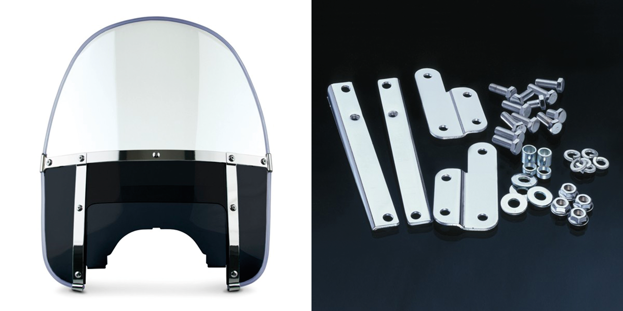 Fits 41mm forks on 1949-1959 FL Hydra Glide and Duo Glide, Complete 1960-1984 style round top windshield kit, clear with black lowers, Beaded H-Duty round top/notched black, National Cycle