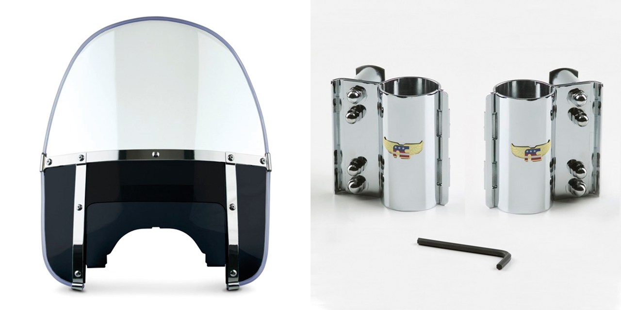Fits 41mm front forks on 1993-2005 FXDWG, 1980-1985 FXWG, 1983 FXDG, 1984-2012 FXST & FXSTC Softail, 1999-2007 FXSTB Night Train and 2000-2007 FXSTD Deuce, Complete 1960-1984 style round top windshield kit, clear with black lowers, Beaded H-Duty round top/notched black, National Cycle