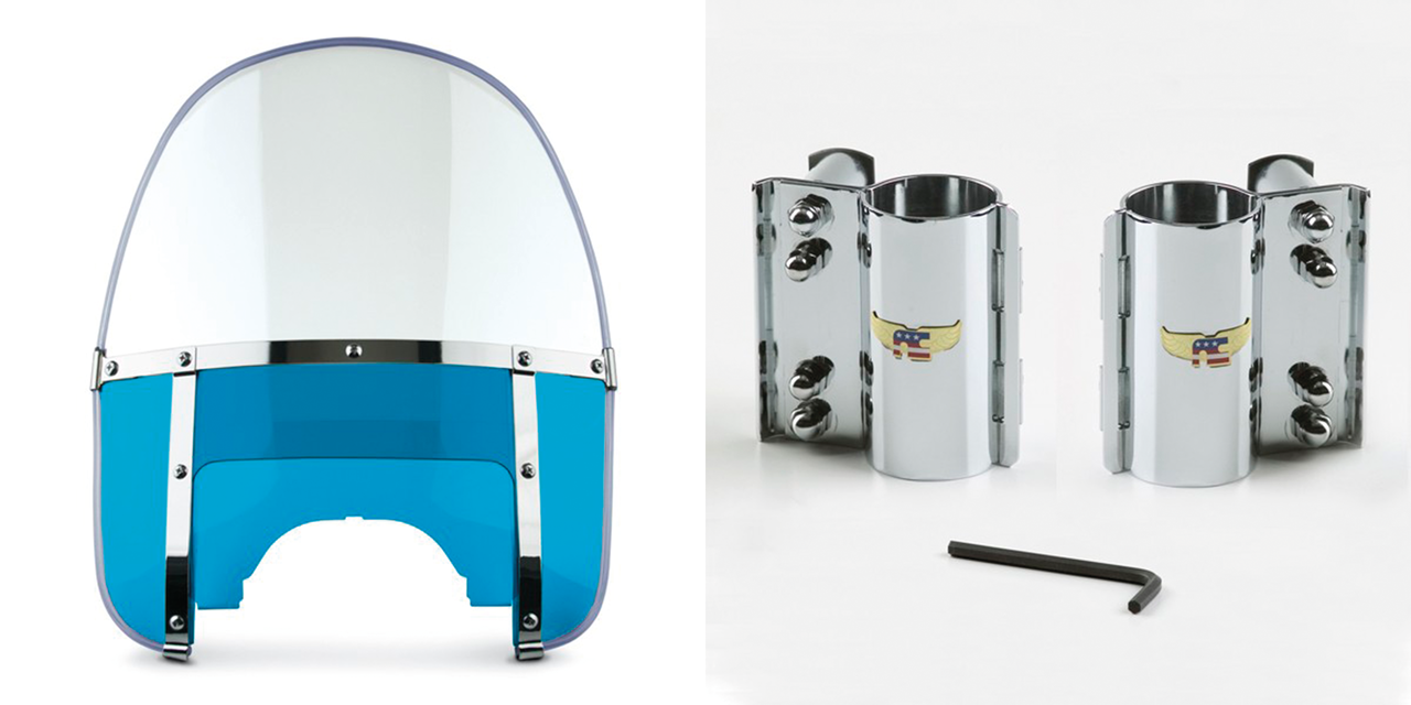 Fits 41mm front forks on 1993-2005 FXDWG, 1980-1985 FXWG, 1983 FXDG, 1984-2012 FXST & FXSTC Softail, 1999-2007 FXSTB Night Train and 2000-2007 FXSTD Deuce, Complete 1960-1984 style round top windshield kit, clear with blue lowers, Beaded H-Duty round top/notched blue, National Cycle