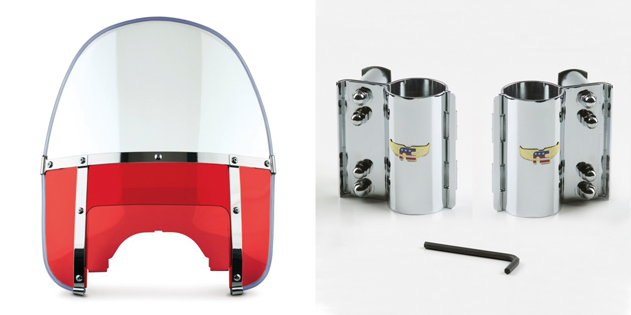 Fits 41mm front forks on 1993-2005 FXDWG, 1980-1985 FXWG, 1983 FXDG, 1984-2012 FXST & FXSTC Softail, 1999-2007 FXSTB Night Train and 2000-2007 FXSTD Deuce, Complete 1960-1984 style round top windshield kit, clear with red lowers, Beaded H-Duty round top/notched red, National Cycle