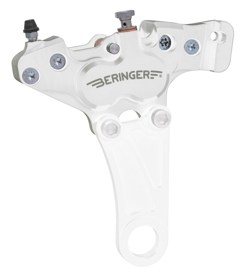 Beringer is manufacturing brake systems for more than 15 years and are appreciated by many factory and private racing teams for their exceptional reliability. The company achieved a decisive technological advantage because of their patented innovations. Beringer is also extensively engineering braking systems for any other motorcycle. Beringer brake systems are produced according to ISO 9001 and are approved. Their brake calipers are made out of aircraft quality aluminum, the same material as being used on wings of supersonic planes. This aluminum combines reduced weight and resistance to deformation, even at high temperatures. The pistons are made of stainless alloy. Stainless alloy only conducts one thirteenth of the heat conducted by aluminum, thus perfectly isolates the calipers from the heat generated by the brake pads. Furthermore, the stainless alloy pistons eliminate the possibility of corrosion. All calipers are CNC machined to meet the highest standards and guarantee optimized material thickness. Beringer calipers distinguish in incisive braking power with a very short response time. More aggressive and stronger braking is achieved at constant lever travel. With these calipers, only 16.5 bar pressure is needed to perform as good as 20 bar with other calipers to reach similar braking power. Calipers are available for front and rear in either 4-piston or 6-piston versions in polished, black anodized or chromed.