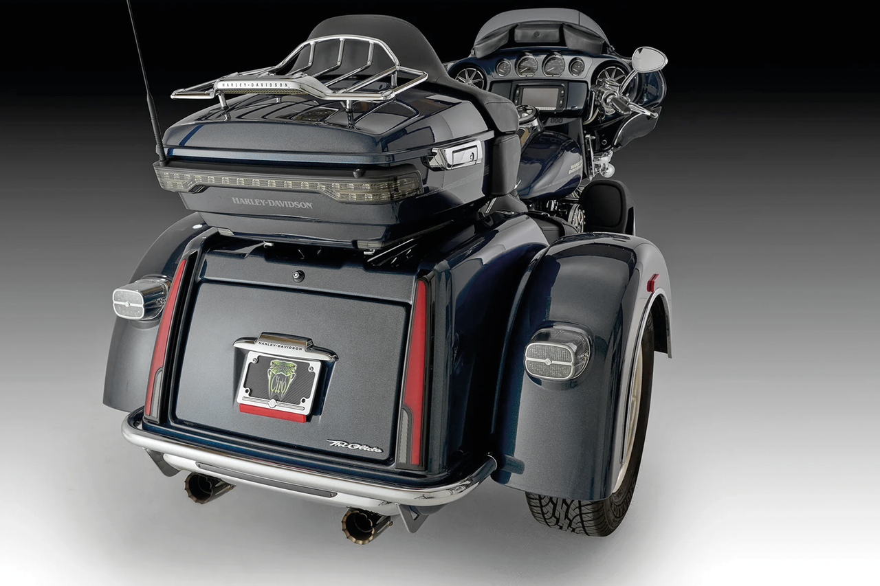 Inspired by classic, luxury automotive design, the Calade tail lights are the most exciting lighting product for your Tri Glide. Packed with the power of a combined 128 LEDs, this lighting system shows the world you have arrived; safely and with style. Lights are red for turn, run, brake and taillight and white for reverse.