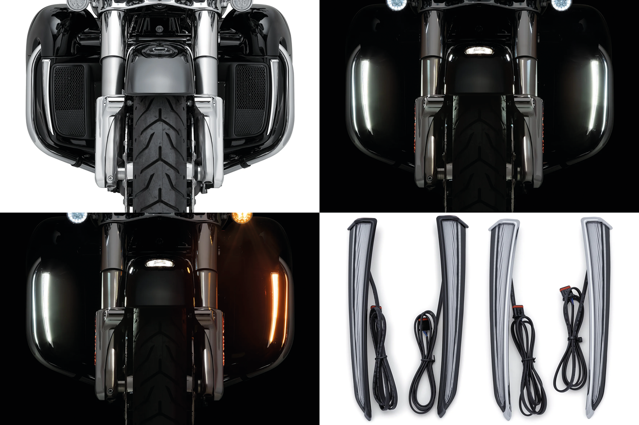 Fits the stock lower fairings and Ultra-style accessory lower fairings (OEM 57100258 and 770887) on 2014-2016 Touring, 2021 to present 107 and 114 CI Touring, 2021-2023 117CI Touring and 2014 to present Trike, Fang lower fairing lights, black