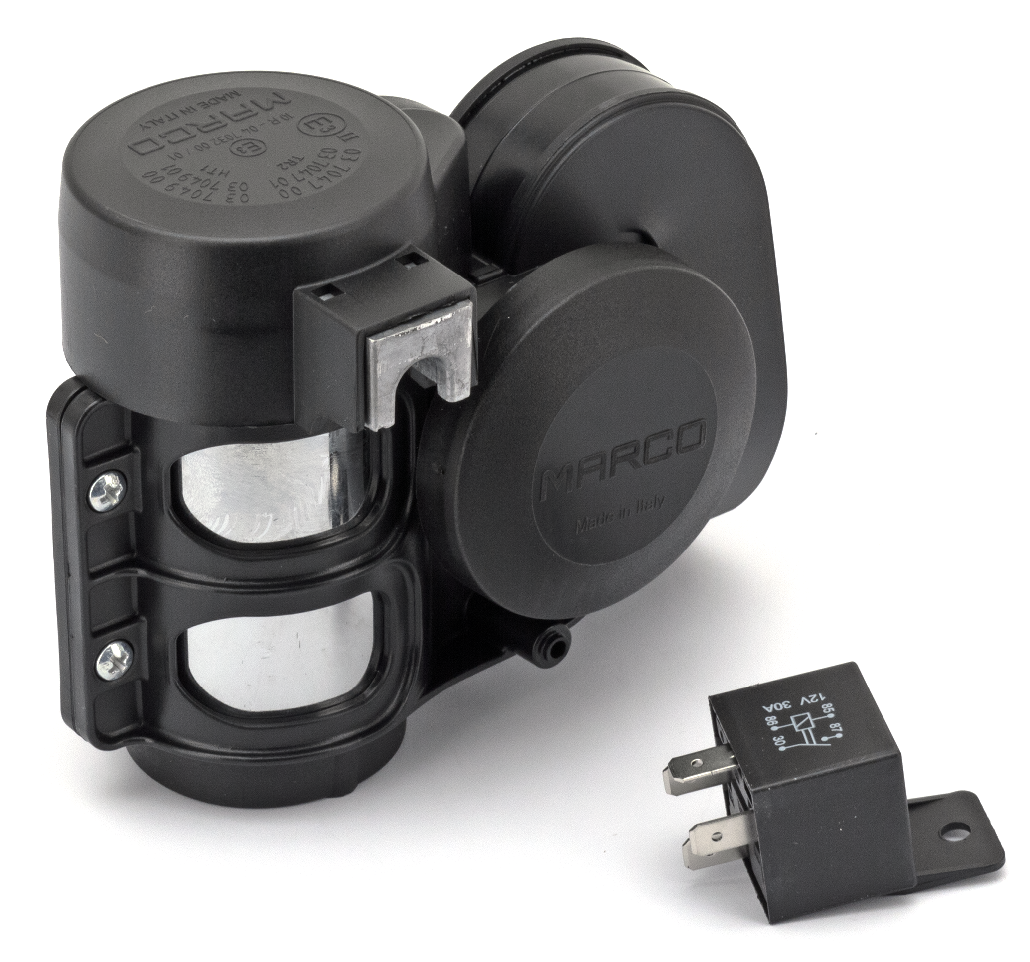 Electro-pneumatic horns have a big advantage over air horns: they feature integrated compressors and therefore there are no external air hoses. Extremely powerful and easy to install as they have just one fixing point. Available as single note or two-tone. The Hurricane single note horns give over 110 dB(a), the Tornado two-tone horns give 112 dB(a), which is almost twice as much noise. Made in Italy.
