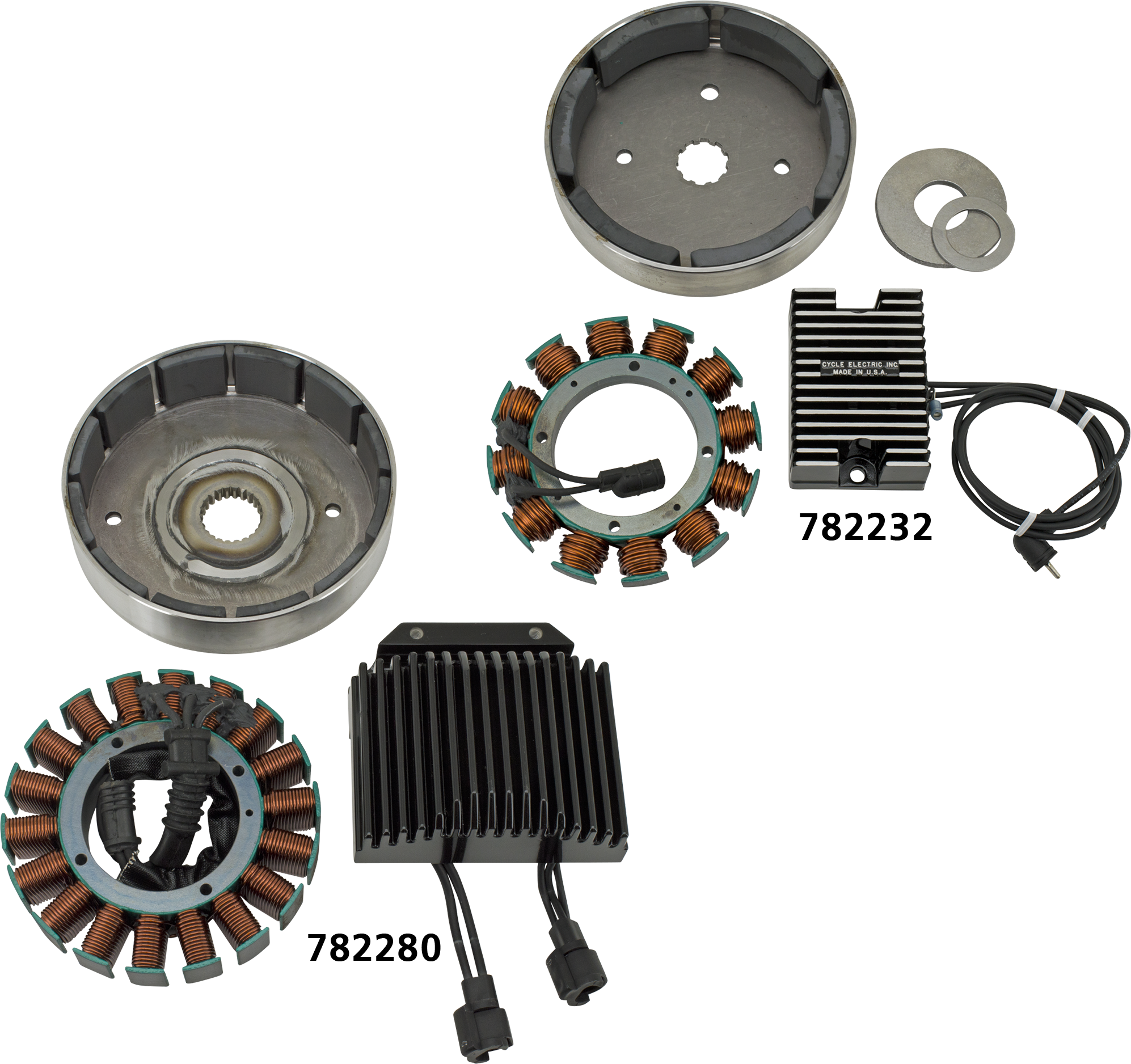 Complete charging systems with Cycle Electric’s state of the art stator, bullet proof rectifying regulator and OEM rotor. They offer better low speed output and a smoother charge to the battery. Cycle Electric Inc. claims that you will not find a more durable, longer lasting charging system. 2 year warranty. Available as stock replacement or Three Phase kits with increased output.