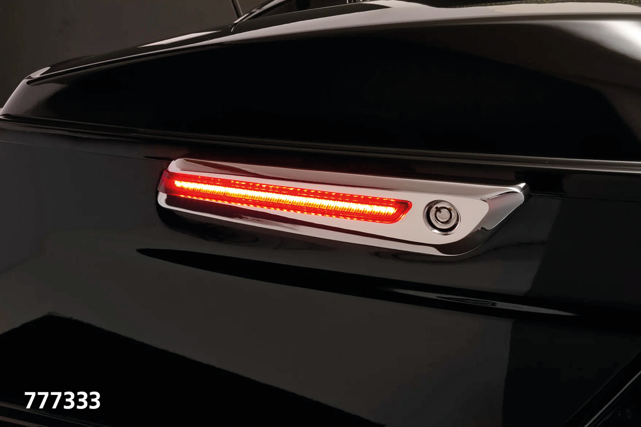 Ciro streamlined the look of a lighted alternative for your OEM hinge covers and reflectors to transform the look of your saddlebags. Available with a light smoke or red lens, featuring red run and brake lights plus animated red turn signals. They come with quick disconnect, plug-n-play harness for easy saddlebag removal.