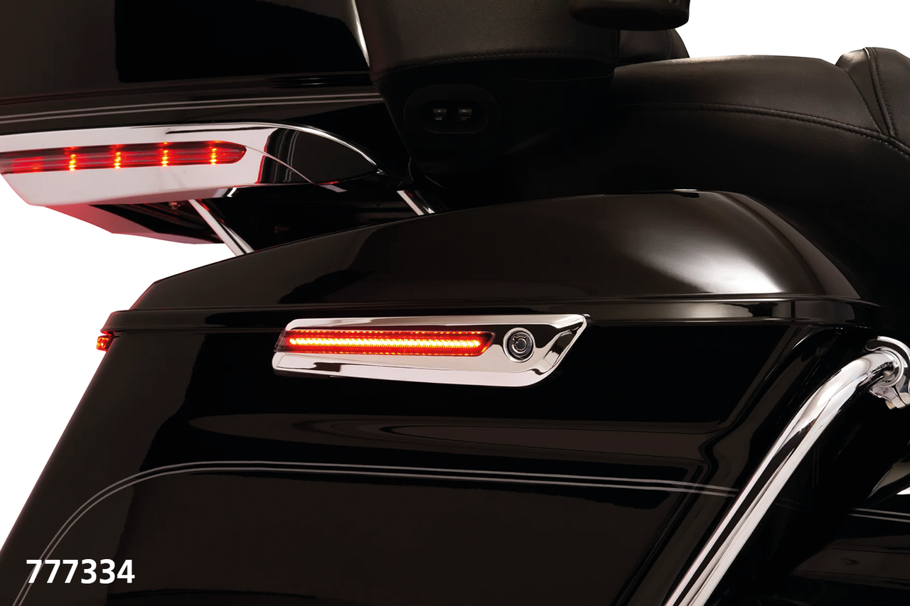 Ciro streamlined the look of a lighted alternative for your OEM hinge covers and reflectors to transform the look of your saddlebags. Available with a light smoke or red lens, featuring red run and brake lights plus animated red turn signals. They come with quick disconnect, plug-n-play harness for easy saddlebag removal.
