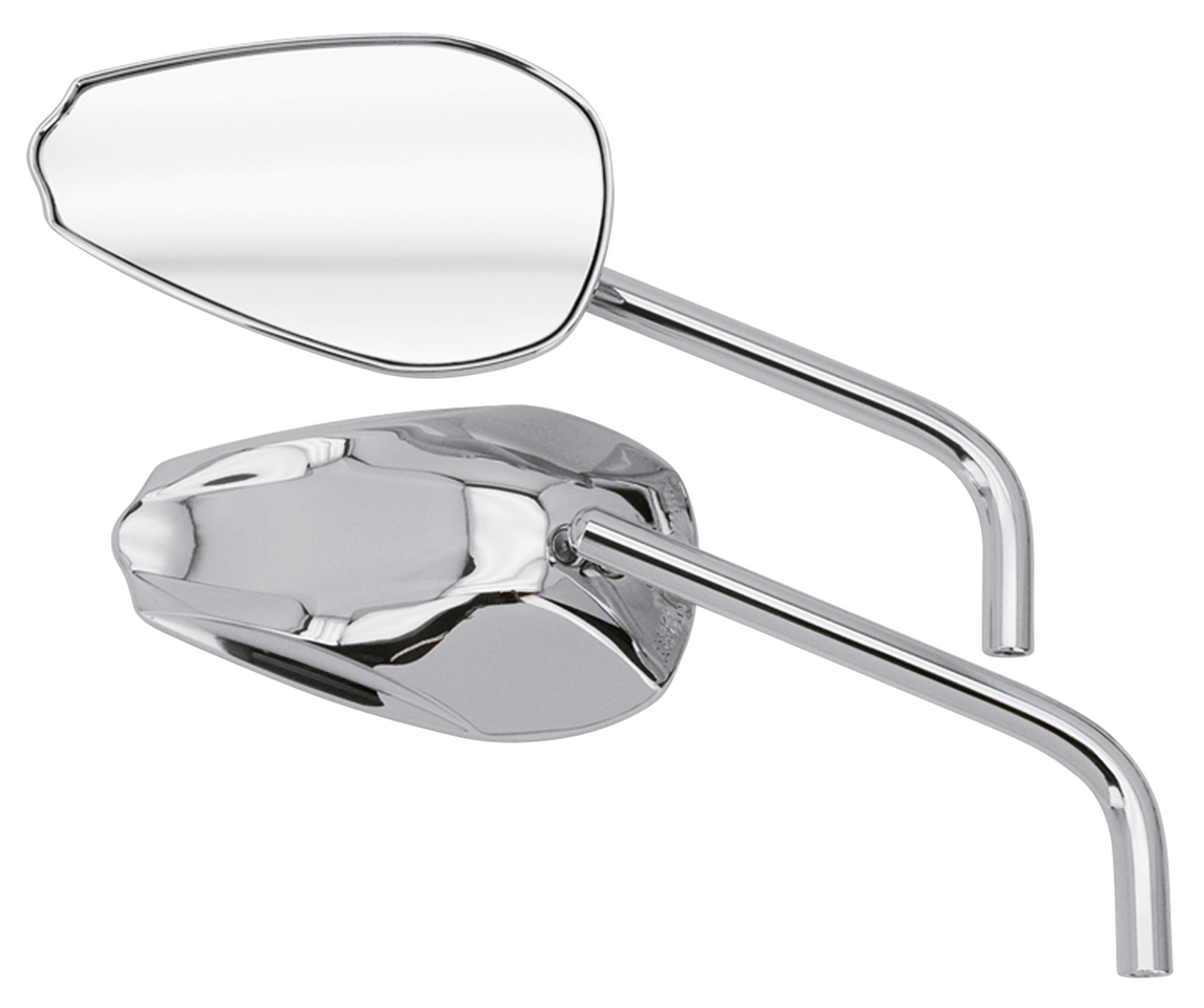 Cobra mirrors feature a unique design. Although a picture tells more than a thousand words, this picture doesn’t tell everything about the many curves and ridges. Mirrors have round stems and heads are 5 3/4″ wide and 3 3/8″ high. These mirrors are EU approved and carry a distinct E approval mark. Available in chrome or matt black, sold in sets of left and right. Includes adapters for fitment on stock handlebar mounts.