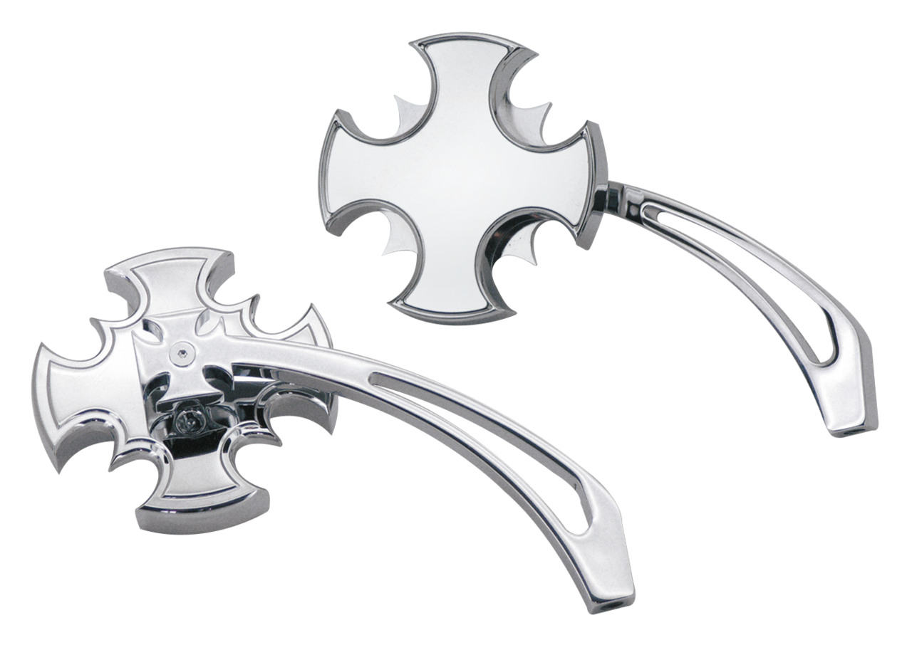 Cross blade mirrors are detailed into perfection. They are 3 1/2″ in diameter and have a 5 3/4″ long cut-out arm that ends in a Maltese cross. Made out of aluminum with a perfect chrome finish. Sold in sets of left and right, chrome mounting bolts included.