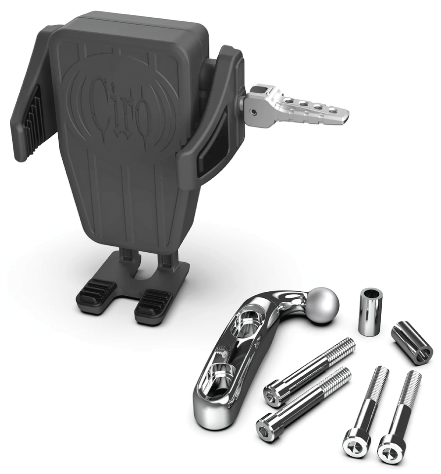 These accessories allows you to mount your phone or camera to any Ciro ball stud. Has bolt patterns and stud mounts for most common phone and camera mounts. When you do not want to worry about draining your phone battery while riding again, we suggest the Ciro Premium Smartphone mount with its built in 1.3 amp USB plug, so you can charge as you ride using the USB cable from your device. The CyberCharger is best for you when you have a Smartphone that supports wireless charging. Mk II CyberChargers feature a slim arm design that allows additional clearance for the buttons on certain models of smartphones. An upgrade kit to change a Mk I into Mk II is also available. The Budget and Premium holders fit devices from 2 1/8″ to 3 1/2″ (54 to 89mm) wide, the CyberCharger takes devices from 2 3/8″ to 4″ (60 to 102mm) wide. For action cameras we have a specific adapter available.