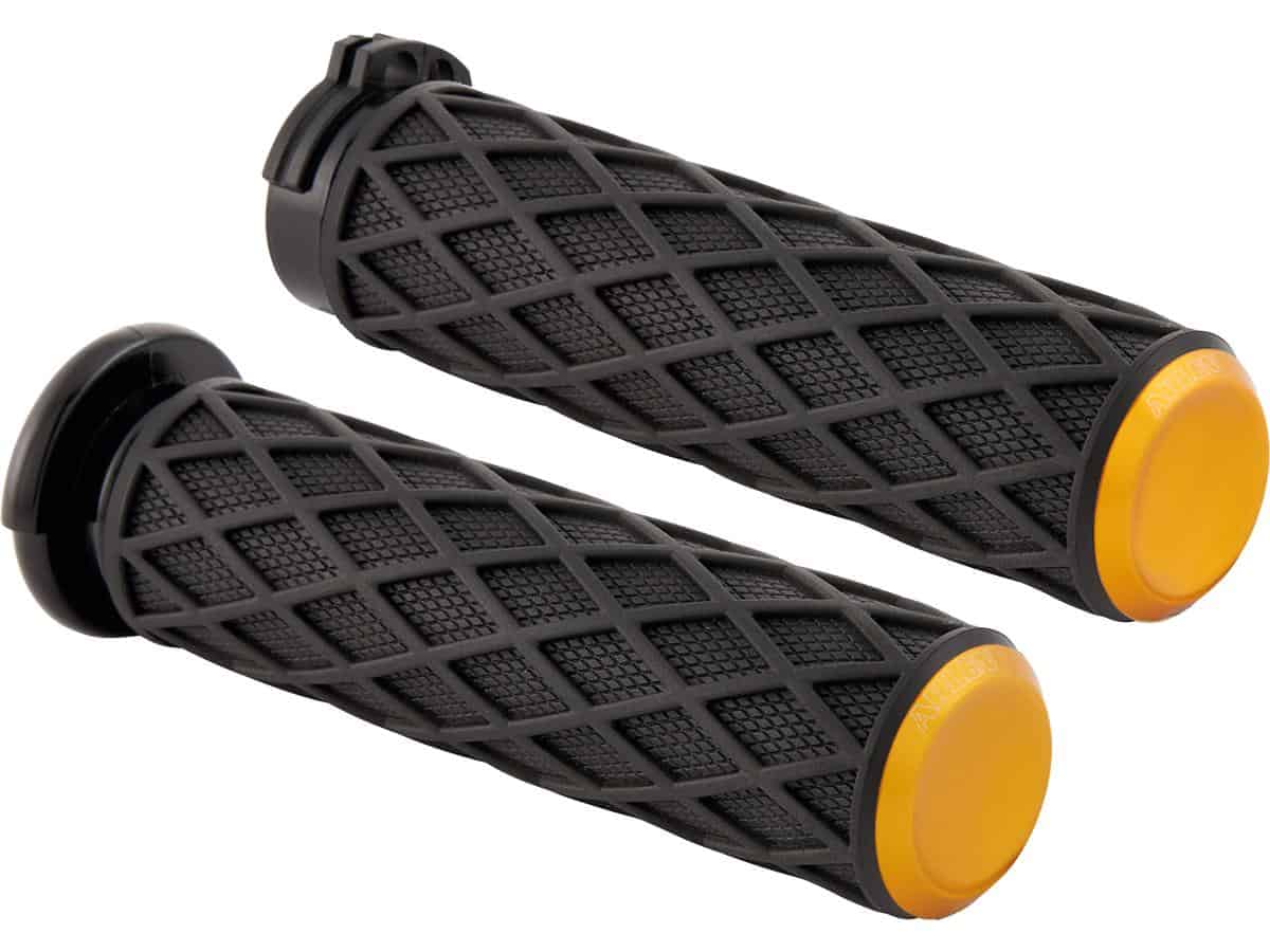 Arlen Ness, Diamond Grips Black Rubber, Gold Endcap 1″ Throttle By Wire, 08-24 Touring, 25 FLHRXS, (except 23 FLTRKSEANV, 23-24 FLHXSE, 23-24 FLTRXSE, 24 FLHX, 24 FLTRX, 24 FLTRXSTSE), 09-25 Trike, 16-24 Softail, 11 FLSTSE2, 12 FLSTSE3, 13-14 FXSBSE, 14-15 FLSTNSE, 16-17 FXDLS