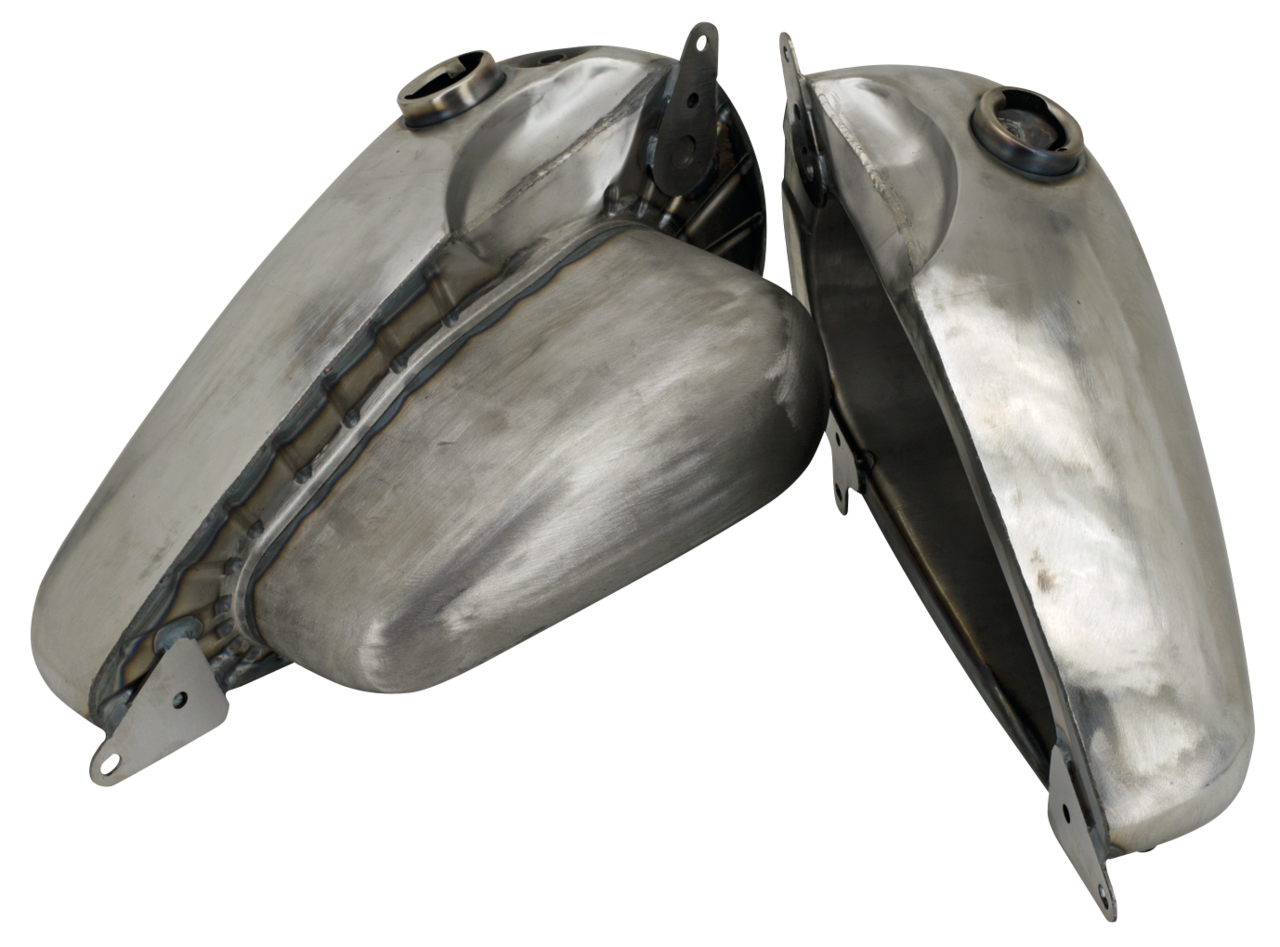 GAS TANKS The zinc-chromate primer finish on some of our tanks is provided for the protection of the tanks during shipment and storage. It is not recommended as a primer finish for paint applications without proper surface preparation. As with any fuel tank, particularly one where custom paint is to be applied, all tanks must be pressure tested, then cleaned with tank cleaner and sealed with tank sealer before painting, to protect the final finish and prevent internal rust during winter storage. Fuel capacity is measured with tank in upright position, angle of parked bike will determine actual capacity of the fuel tank.