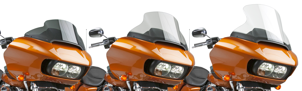 National Cycle’s innovative VStream Windscreen gets its name from the unique shape and dimensional contours designed and engineered into the windscreen. The patented “V” profile helps push the turbulent wind out and away from the side of the rider’s head, producing a quieter and more comfortable riding experience for both the rider and the passenger. VStream Windscreens are designed specifically for each model bike to ensure optimum performance and perfect fit using the OEM mounting hardware. Windscreens are made from the finest windshield material in the world, 4.0mm thick Lexan polycarbonate. This material is 20 times more impact resistant than acrylic or other plastic windshields, reason why National cycle gives a 3-year warranty against breakage. Additionally this polycarbonate features National Cycle’s exclusive Quantum coating. This provides 10 times better scratch resistance than any other windshield material on the market. The Tall and Standard sizes are outstanding high-speed highway performers for FLHT/FLHX riders. Enjoy a significant improvement in wind management and riding comfort. If you want a custom look and a lower profile, you will like the performance of the VStream models in Low or Ultra Low. Height is measured from the bottom to the top on the center of the screen.