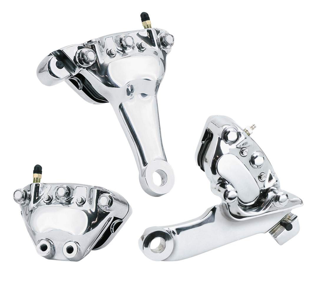 These beautifully chrome plated calipers are a direct replacement for the OEM counterparts. Trick design front brake calipers can be used for ether left or right side applications. Rear brake calipers feature integrated caliper brackets. Both front- and rear calipers add more shine to your motorcycle. Calipers come complete with brake pads. Sold each.