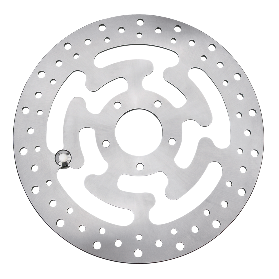 Stock replacement disc brake rotors. Feature more pre-drilled holes than stock for improved braking in the wet. Can be used on both ABS and non-ABS equipped models. Discs are 11.8″ (300mm) outer diameter. Front discs are 5mm thick, rear disc is 7mm thick.