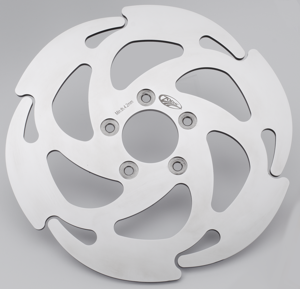 Fits front on all single and dual disc 2000 thru 2013 Sportster, 2000 thru 2007 Touring, 2000 thru 2005 Dyna and 2000 thru 2014 Softail. Can also be used rear on 2000 thru 2010 Sportster, 2011 Sportster with wire wheels, 2000 thru 2017 Dyna and Softail and 2000 thru 2007 Touring when the mounting holes are drilled to 3/8″. Disc has 11 1/2″ outer diameter, 2 7/32″ inner diameter and 5/16″ counterbore mounting holes., Right, GZP Wave Disc R/H 2000 UP, Zodiac (Genuine Zodiac Products)
