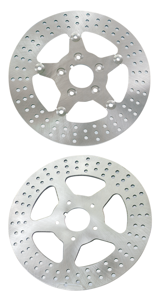 Laser-cut Stainless Steel disc brake rotors, precision ground to create a perfect flat surface for optimal brake power. These “5 Point Star” disc brake rotors are available in both a solid and floating versions to fit the front (single/dual) of all Big Twin and Sportster models 1984 to present. Floating discs are also available with a black finished center. Sold each.