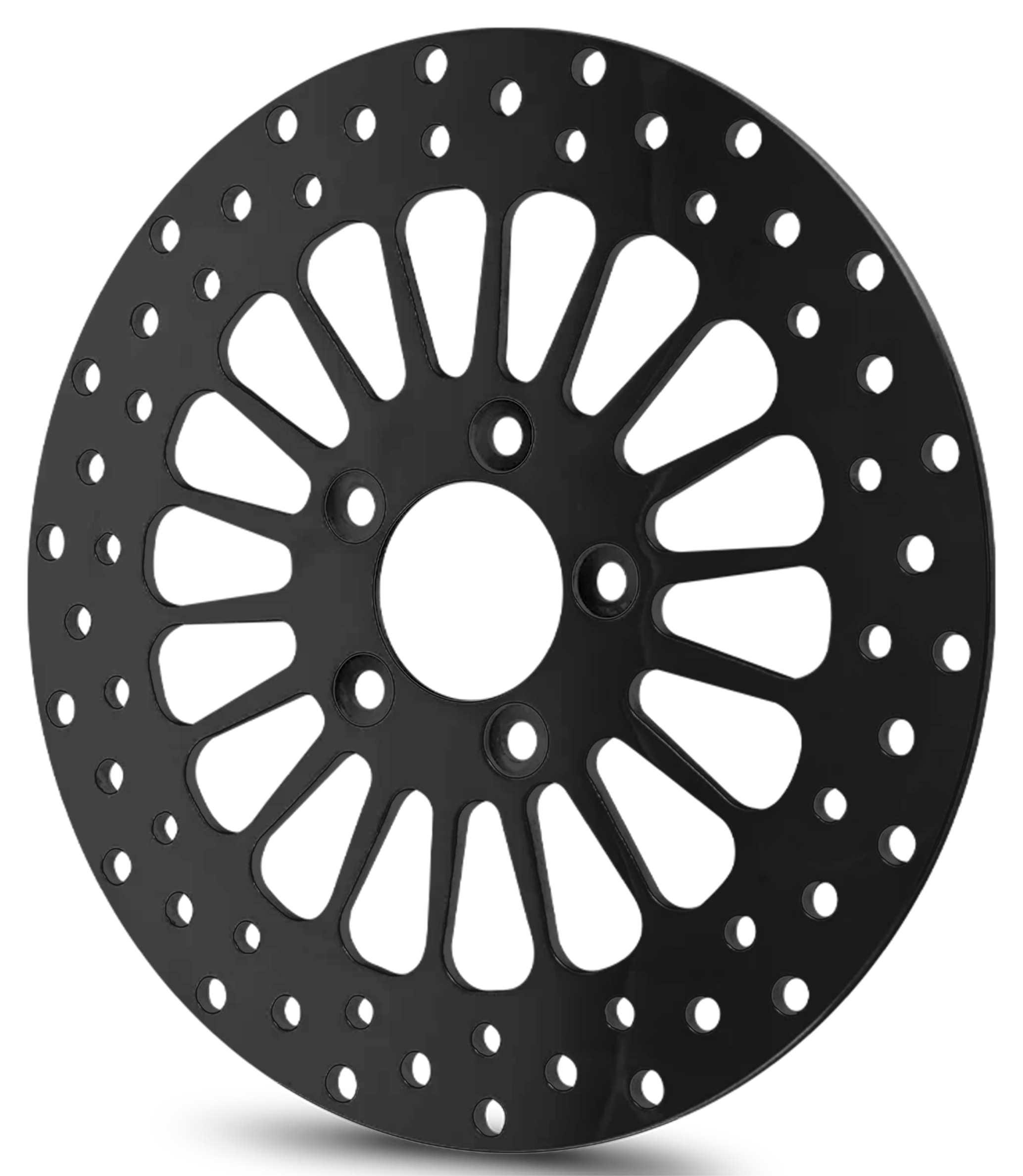 Fits front on VRSCX V-Rod 2007, VRSCAW V-Rod 2008-2010, Dyna 2006-2017, XL Sportster 2014-2022, FLHR & FLHRC Road King 2008 to present, Touring 2008-2013 and Softail 2015 to presentHub mounted disc has 11.8″ (300mm) outer diameter, 2 7/32″ (56.4mm) inner diameter and five 5/16″ counterbore mounting holes on a 3 1/4″ circle, Black zinc coated, FR Super Spoke 11.8″ Rotor Black, DNA