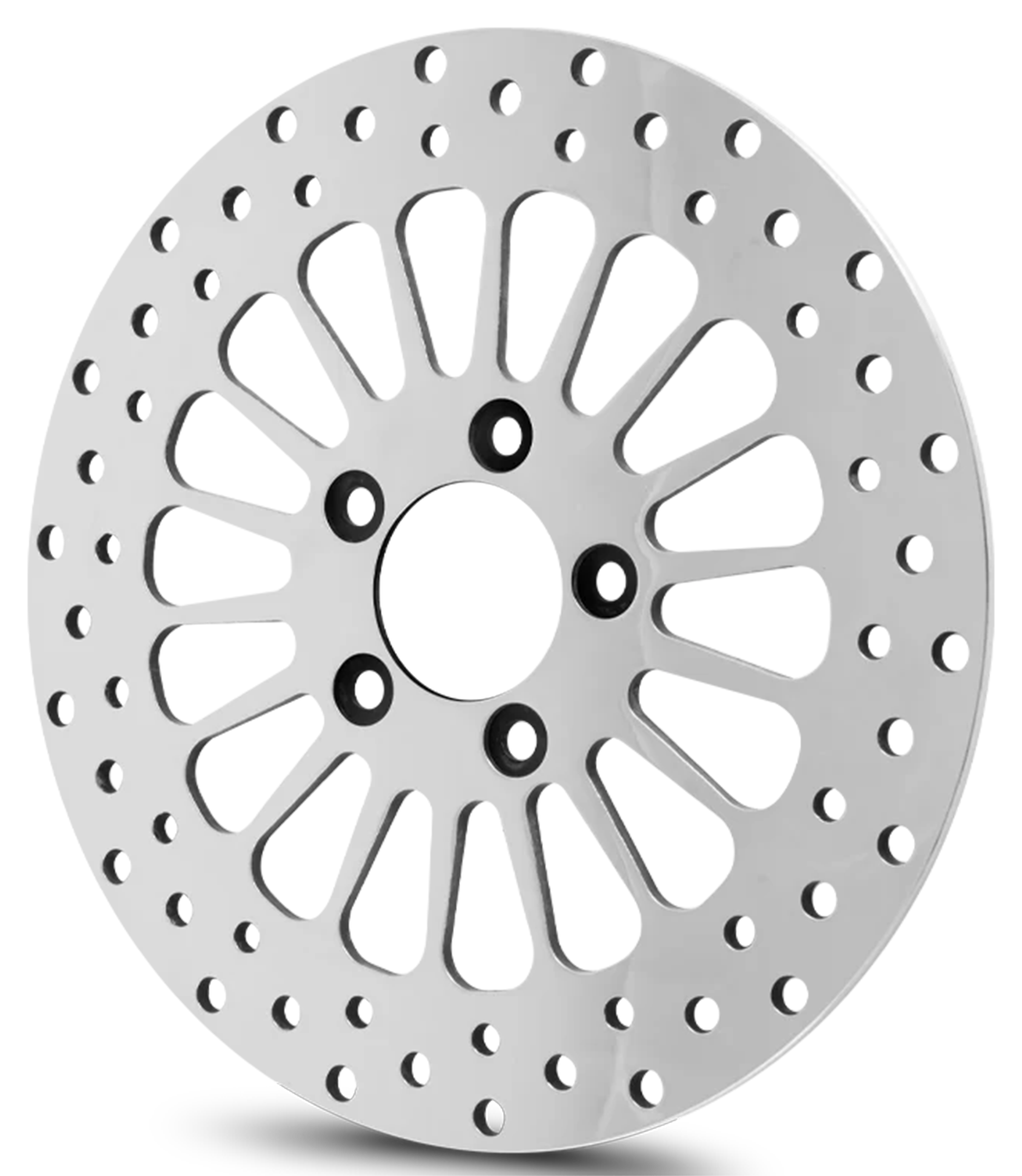 Fits front on VRSCX V-Rod 2007, VRSCAW V-Rod 2008-2010, Dyna 2006-2017, XL Sportster 2014-2022, FLHR & FLHRC Road King 2008 to present, Touring 2008-2013 and Softail 2015 to presentHub mounted disc has 11.8″ (300mm) outer diameter, 2 7/32″ (56.4mm) inner diameter and five 5/16″ counterbore mounting holes on a 3 1/4″ circle, Polished stainless, FR Super Spoke 11.8″ Rotor Polished, DNA