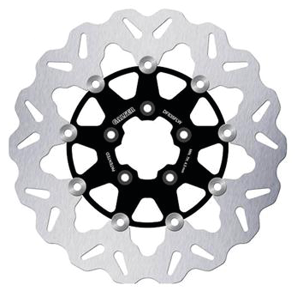 Galfer brake discs for use with stock and stock-replacement calipers. Full floating discs have stainless steel outer bands with black coated steel centers, held by and clear stainless floating elements. As with every brake disc it is strongly recommended to install new brake pads with a new brake disc.
