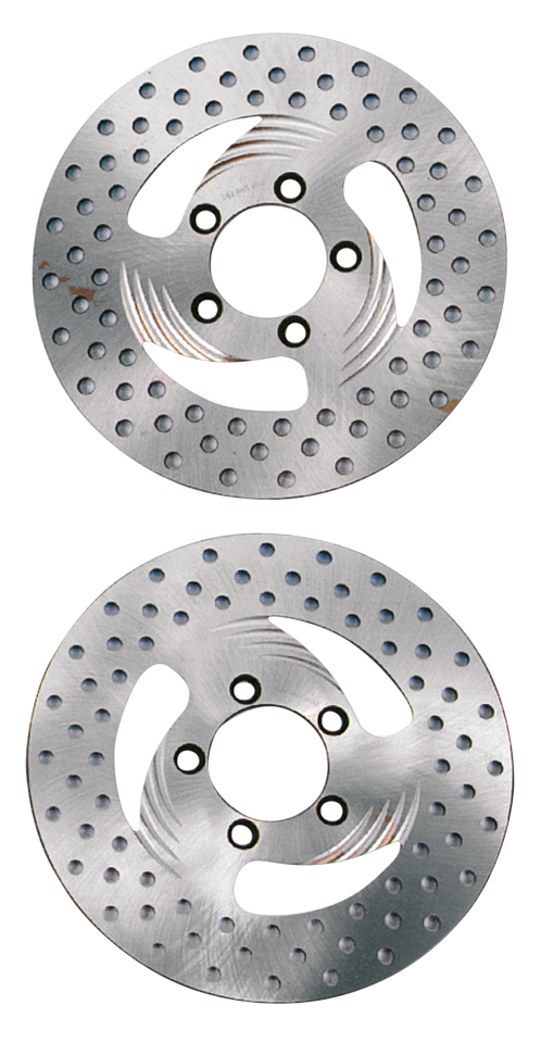 Another special, High Quality Directional Stainless Steel disc brake rotors to fit most Harley-Davidson 1973-1999. The rotors are surface induction hardened with a 12-14% chrome content for superior wear characteristics on #420 steel plate. They have a directional design and are precision-ground for trueness. Each of these rotors are interchangeable with their OEM counterpart. They look great on our aluminum Custom wheels. Also check out our chrome plated hardware sets for mounting these discs.