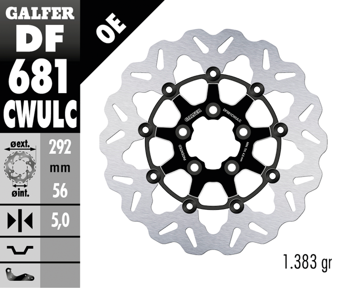 Galfer Wave floating discs offer precise and efficient braking and a significant weight saving. Unless differently indicated they feature black coated stainless steel floaters that attach the stainless steel band to the aluminum carrier. Discs are for use with stock and stock-replacement calipers. Discs are sold each, order two for dual disc applications. As with every brake disc it is strongly recommended to install new brake pads with a new brake disc.