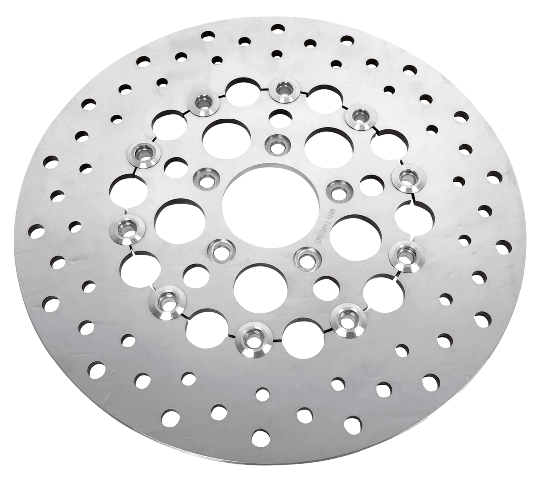 Fits rear on 2000-2010 Sportster, 2000-2017 Dyna (except FXDLS), 2000-2017 Softail (except FXSTD with 17″ wheel & FXSE) and 2000-2007 Touring, Rear floating disc. Has 11 1/2″ outer diameter and 2.22″ inner diameter (OEM 44359-00A)