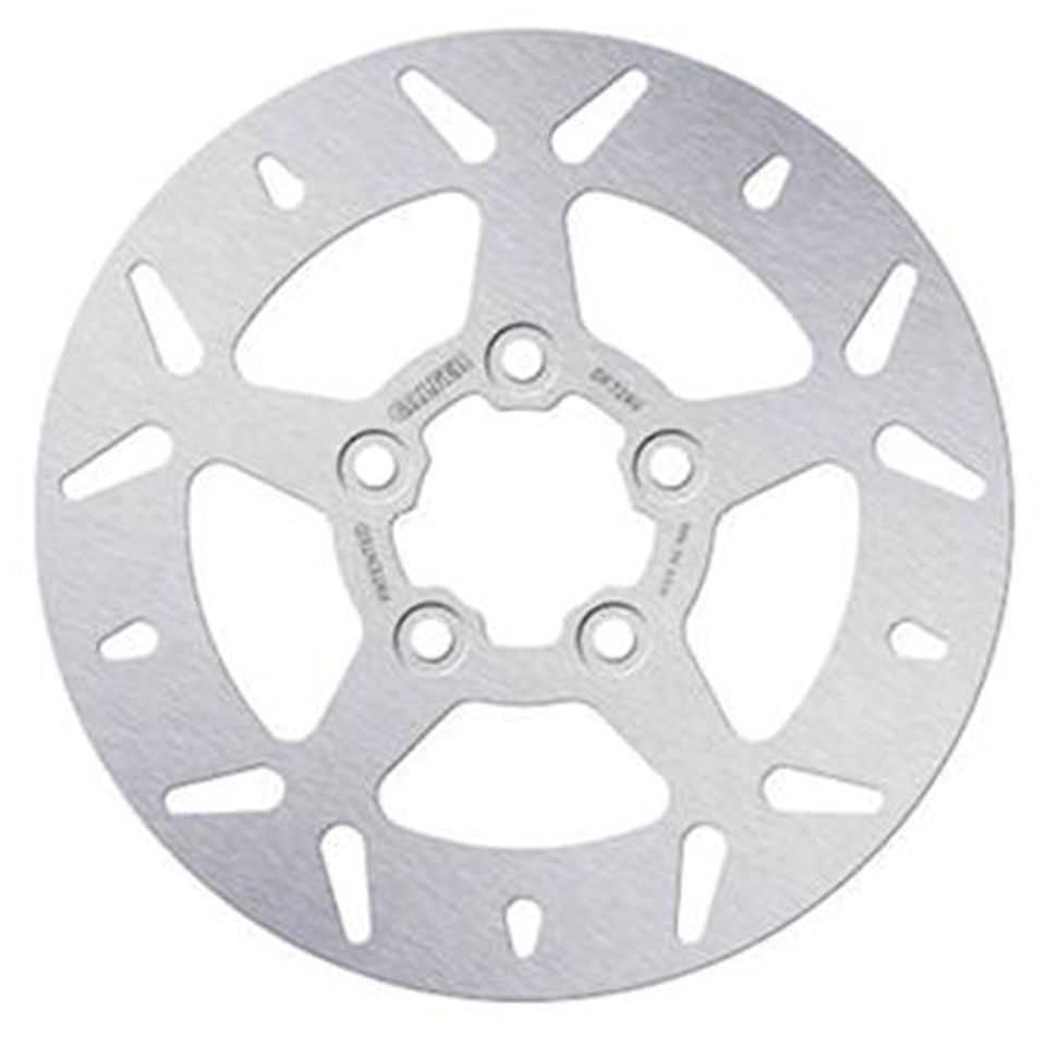 Fits rear on 2008-2013 XR1200 and 2011-2022 XL SportsterDisc has 10 1/4″ (260mm) outer diameter, 2 7/32″ inner diameter and five 3/8″ counterbore mounting holes on a 3 1/4″ circle, Round fixed disc