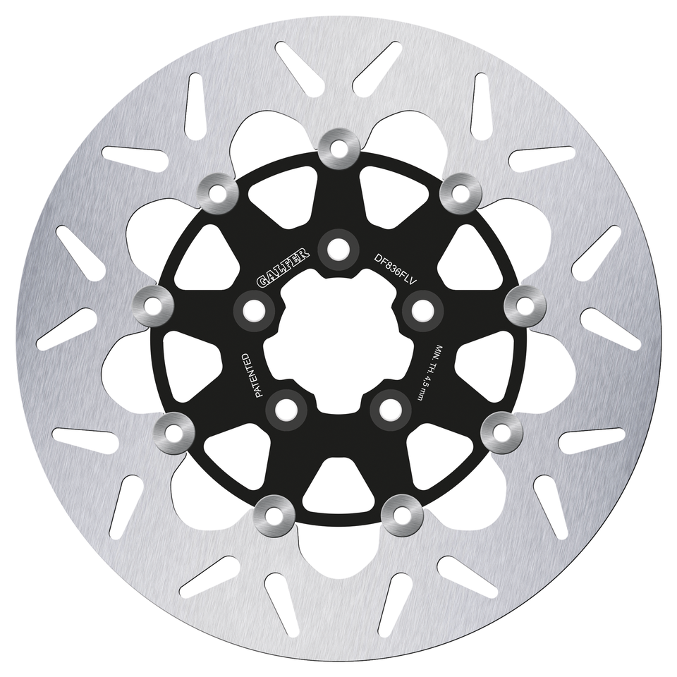 Galfer brake discs for use with stock and stock-replacement calipers. Full floating discs have stainless steel outer bands with black coated steel centers, held by and clear stainless floating elements. As with every brake disc it is strongly recommended to install new brake pads with a new brake disc.